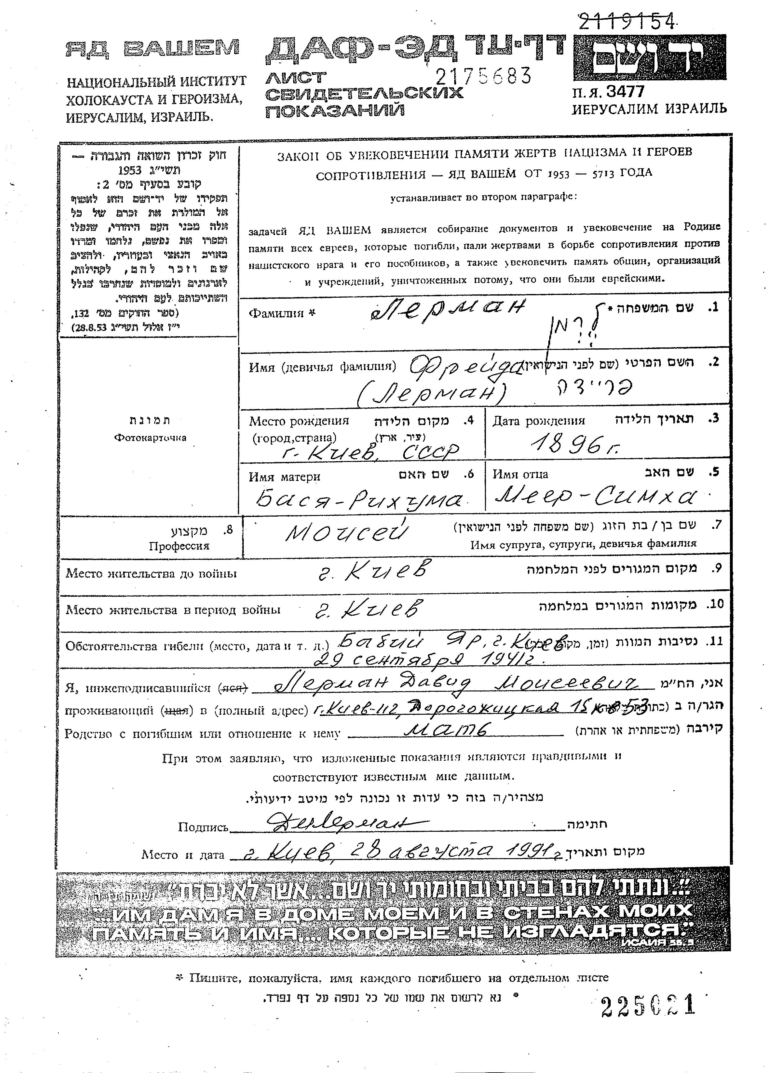Lerman Freida 1896 Kiyev, Ukraine (URSS) Feuille de témoignage