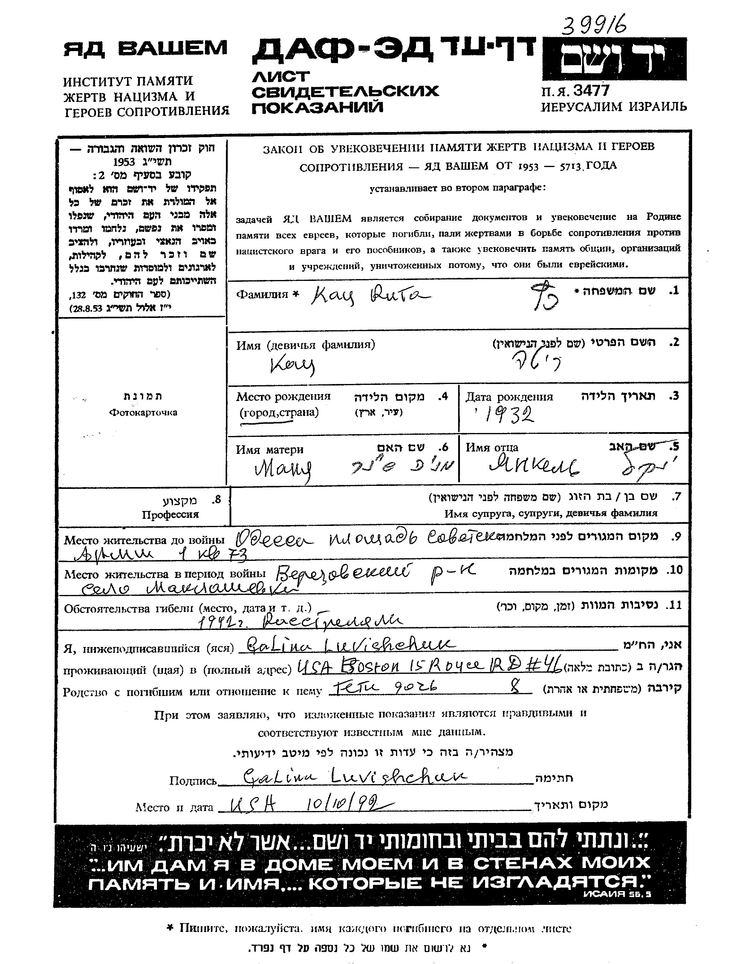 Katz Rita 1932 Odessa, Ukraine (URSS) Feuille de témoignage