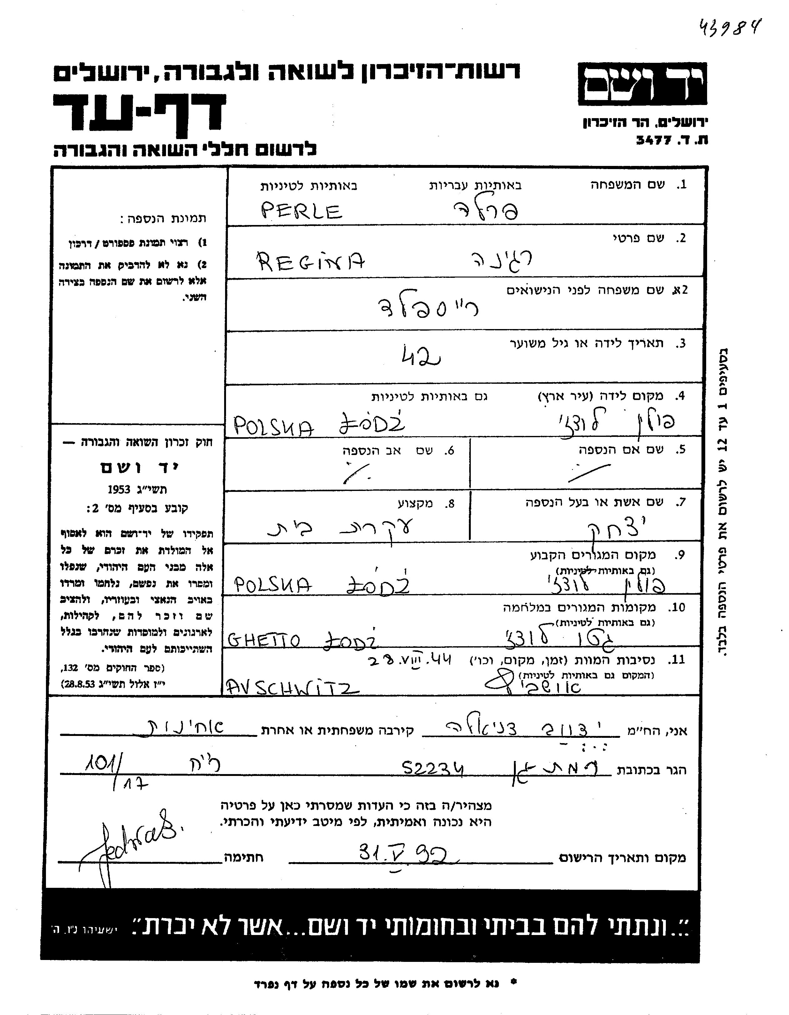 Perle Regina Lodz, Pologne Feuille de témoignage