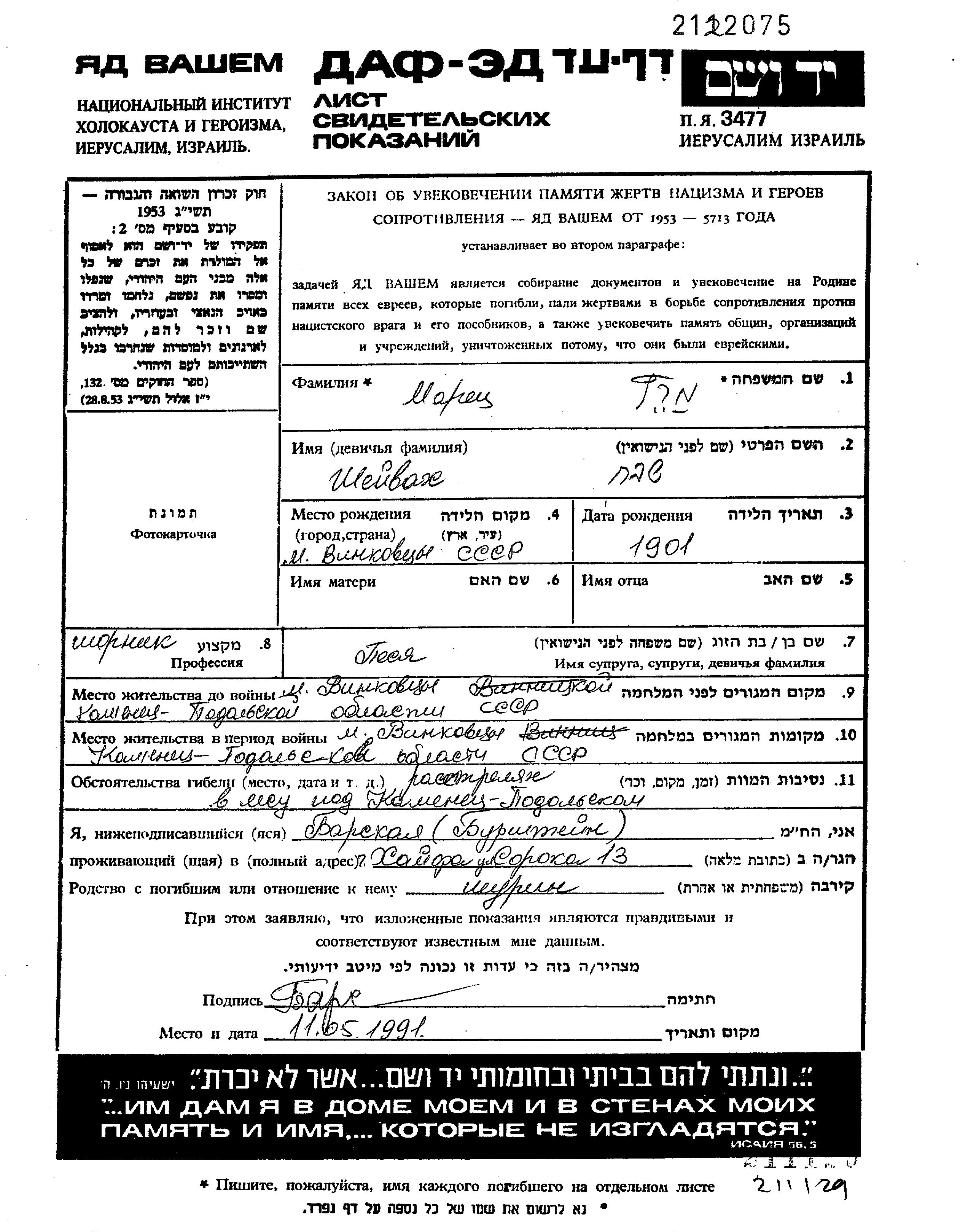 Maretz Sheivakh 1901 Vinkovitsy, Ukraine (URSS) Feuille de témoignage