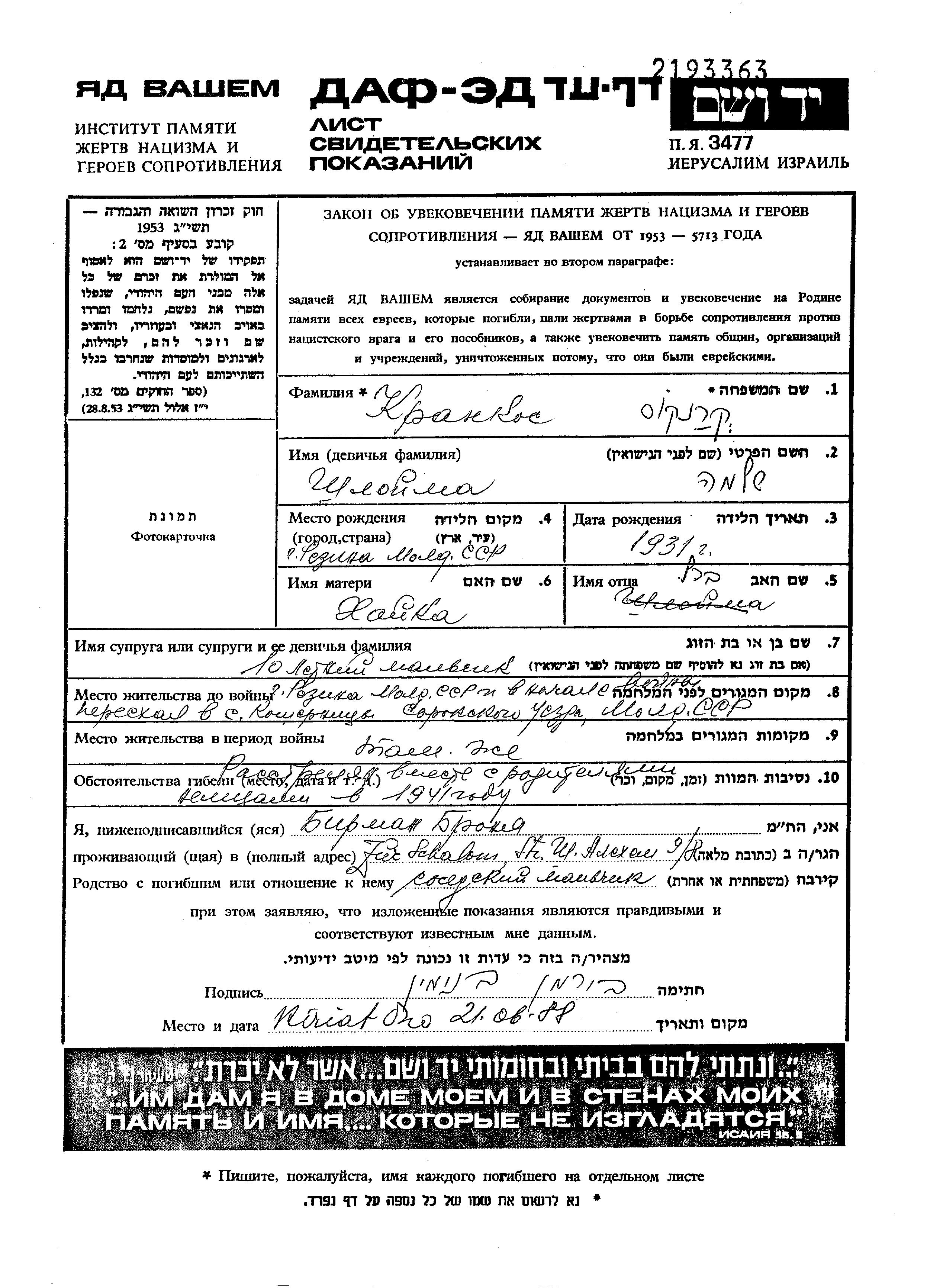 Krankos Shloima 1931 Rezina, Roumanie Feuille de témoignage