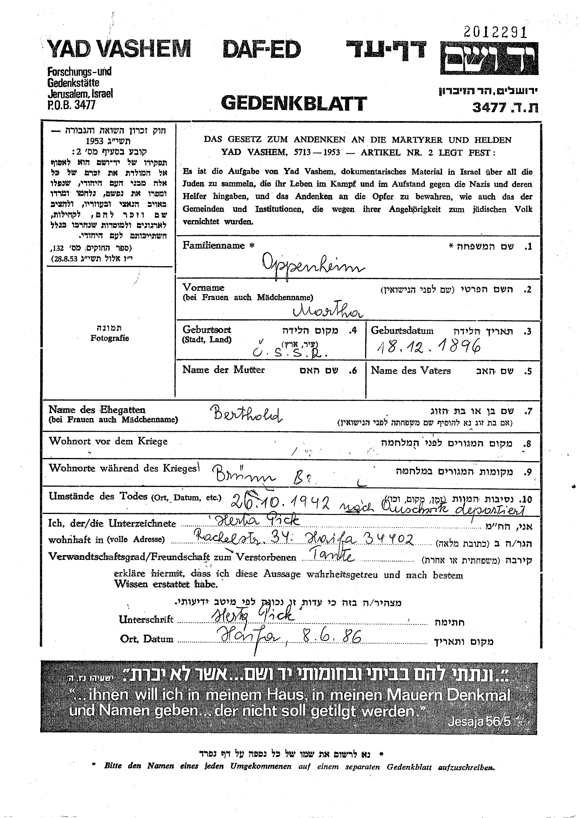 Oppenheim Marta 1896 endroit inconnu, Feuille de témoignage