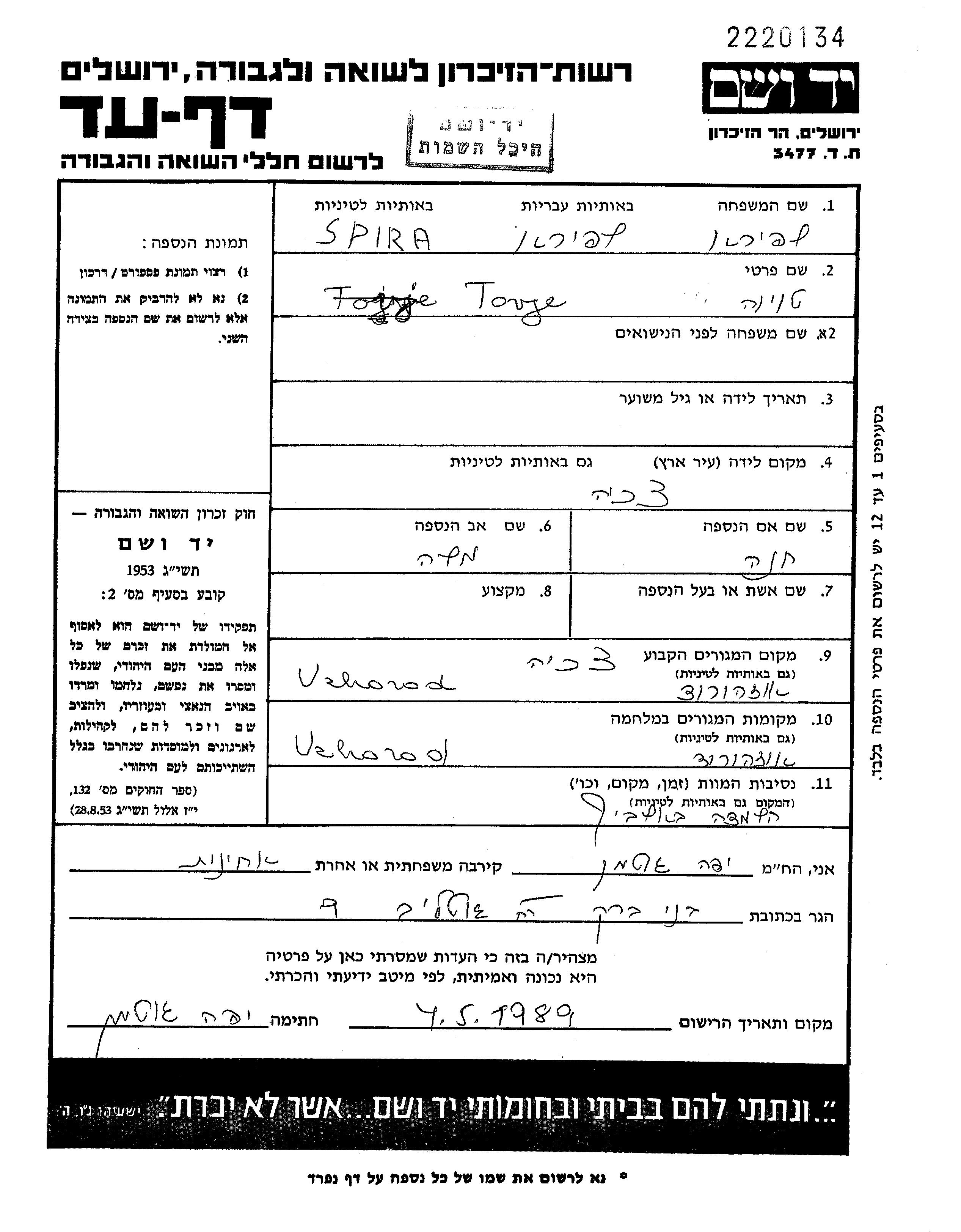 Tovje Spira est né à Tchécoslovaquie, fils de Moshe et de Khana. Avant la seconde guerre mondiale il vivait à Uzhorod, Tchécoslovaquie. Au cours de la guerre, il était à Uzhorod, Tchécoslovaquie.
