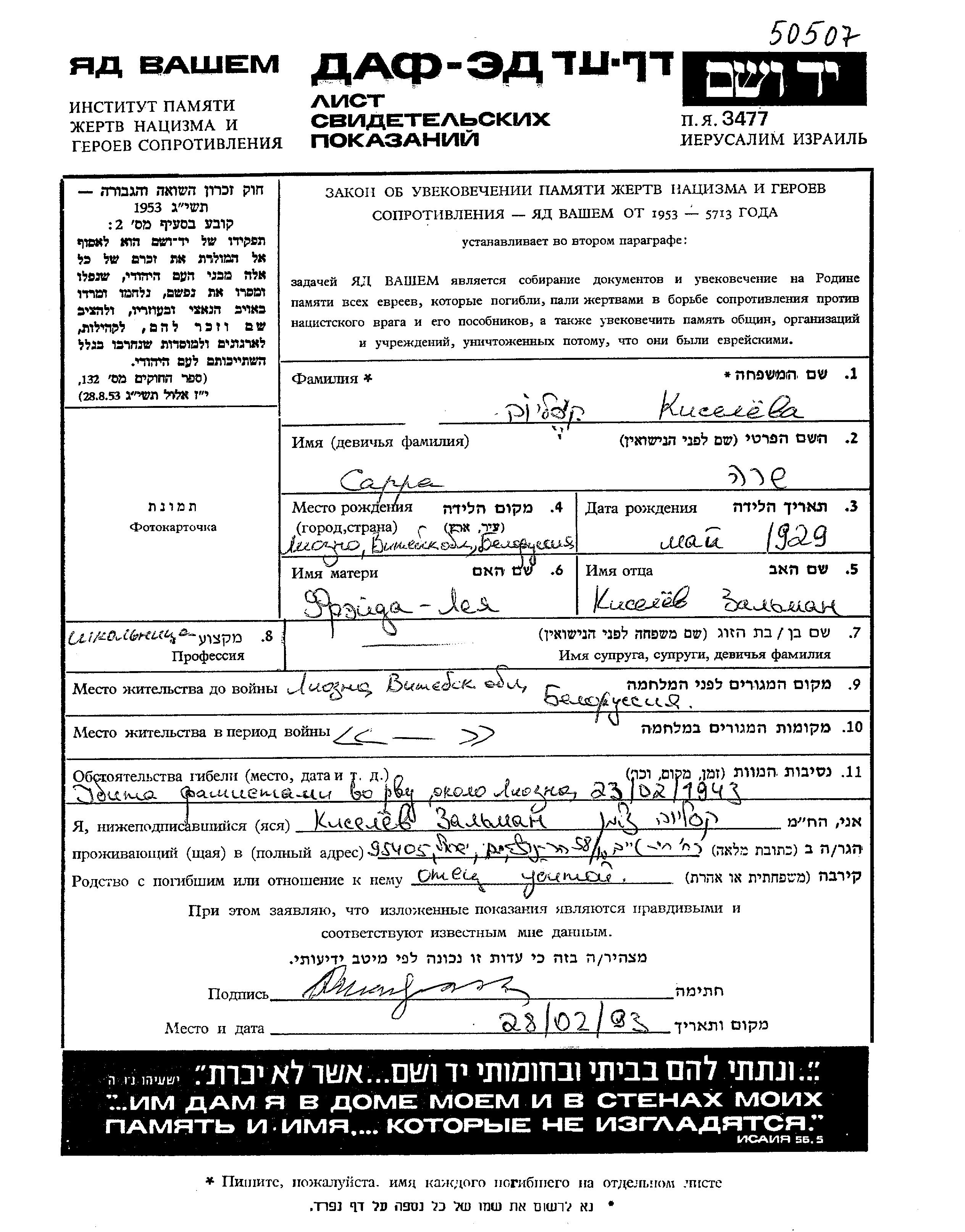 Kiselyov Sara 1929 Liozno, Bélorussie (URSS) Feuille de témoignage