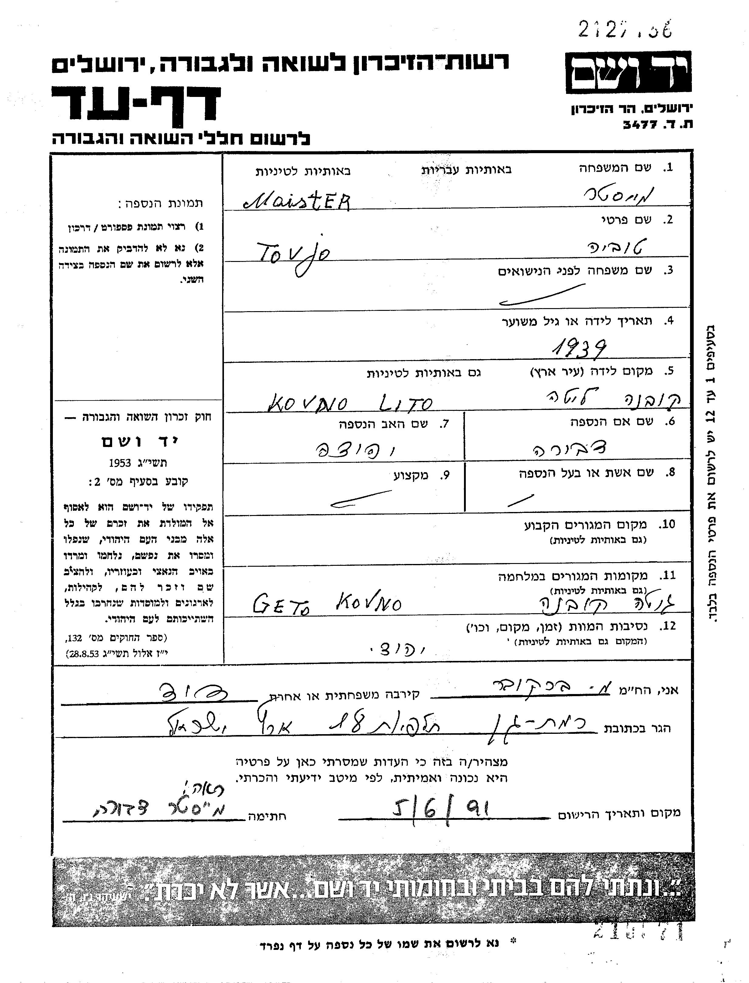 Tovjo Tuvia Maister est né à Kowno, Lituanie en 1939, fils de Yehuda et de Dvora née Berkover. Il était Enfant. Au cours de la guerre, il était à Kowno, Lituanie.