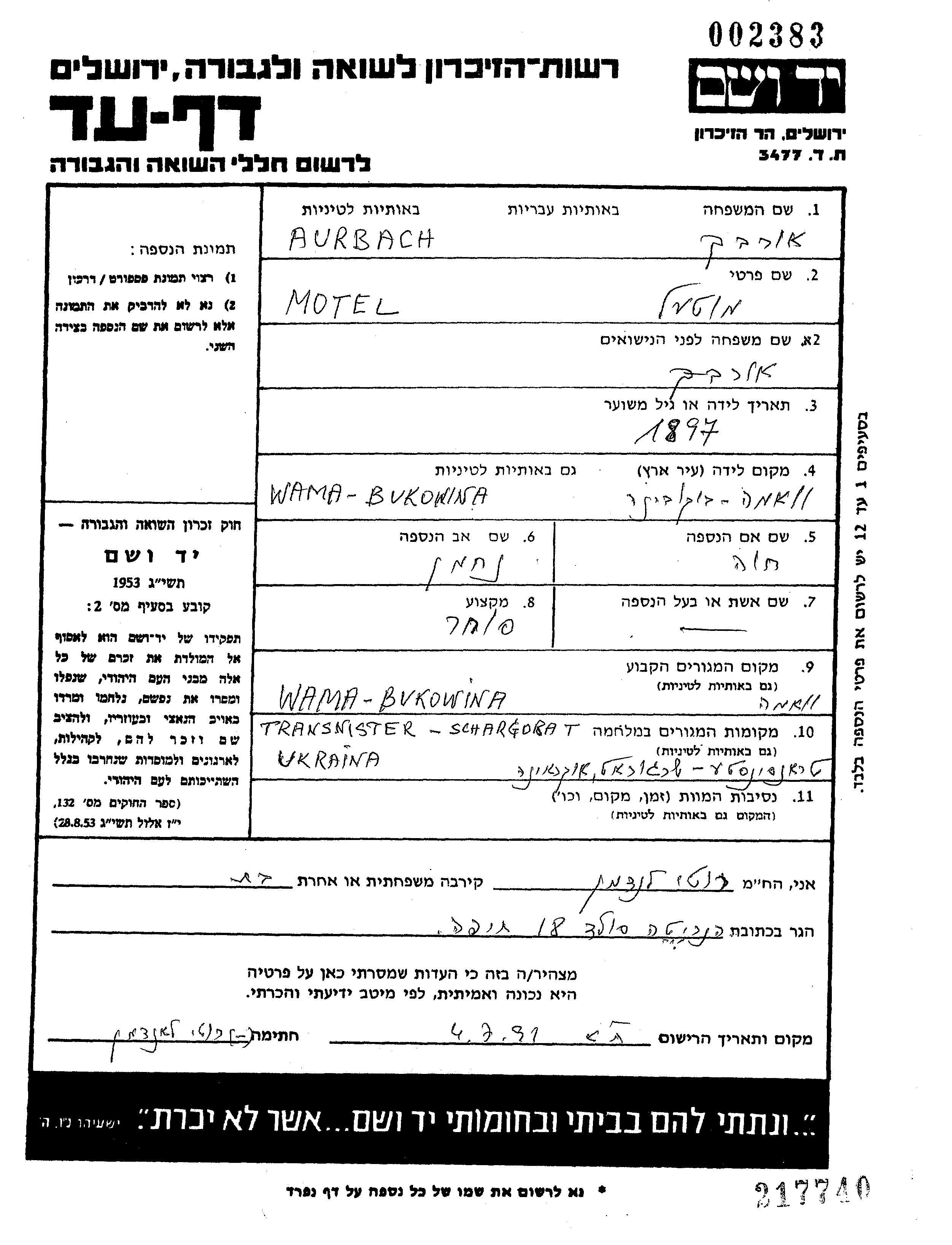 Motel Aurbach Orbakh est né à Vama, Roumanie en 1897, fils de Nakhman et de Khaia. Il était Commerçant/e. Avant la seconde guerre mondiale il vivait à Vama, Roumanie. Au cours de la guerre, il était à Shargorod, Ukraine (URSS).