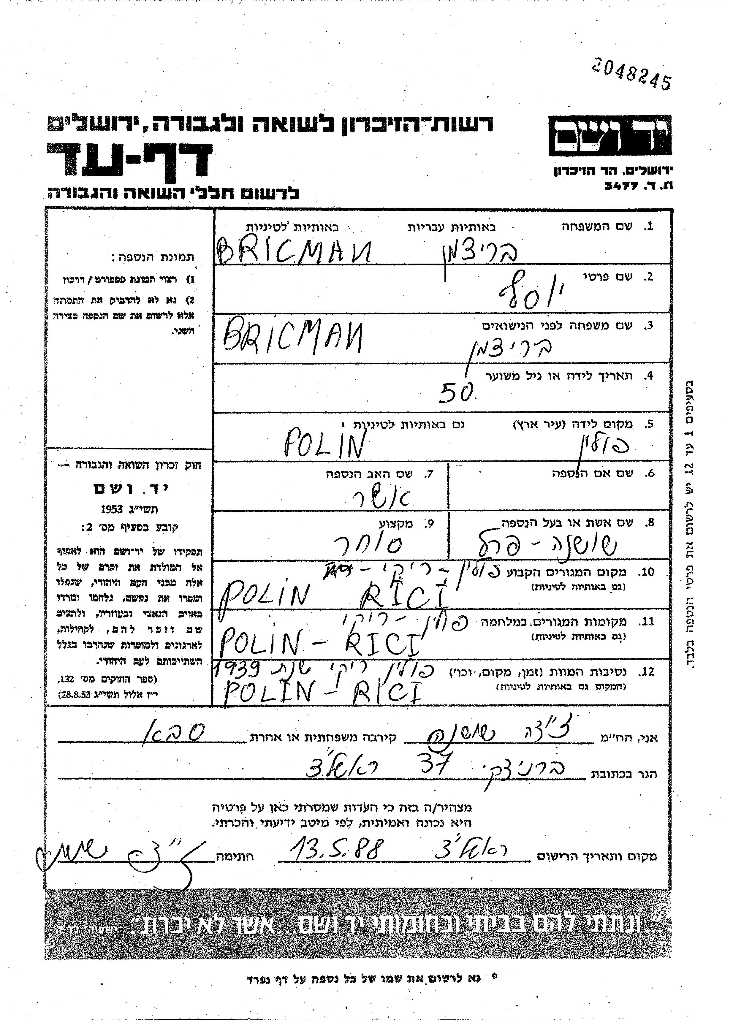 Yosef Bricman est né à Pologne en 1889, fils de Asher. Il était Commerçant/e et Mariée à Shoshana Perel. Avant la seconde guerre mondiale il vivait à Ryki, Pologne. Au cours de la guerre, il était à Ryki, Pologne.
