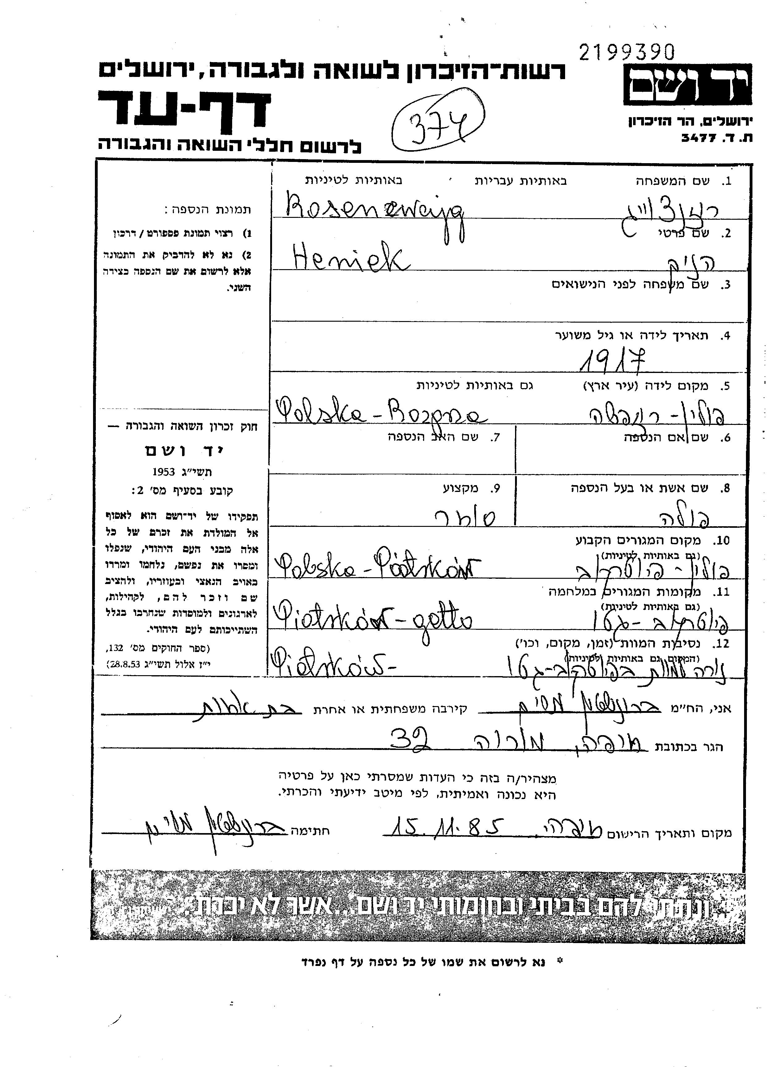 Rosencwejg Heniek 1917 Piotrkow Trybunalski, Pologne Feuille de témoignage