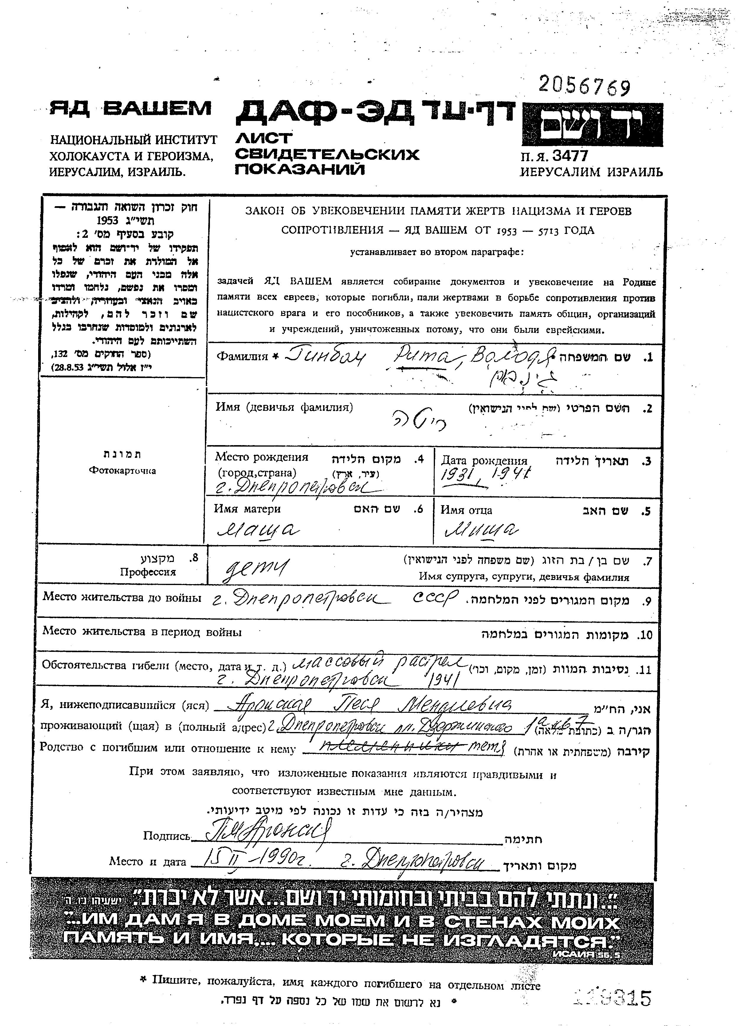 Ginbom Rita 1931 Dnepropetrovsk, Ukraine (URSS) Feuille de témoignage