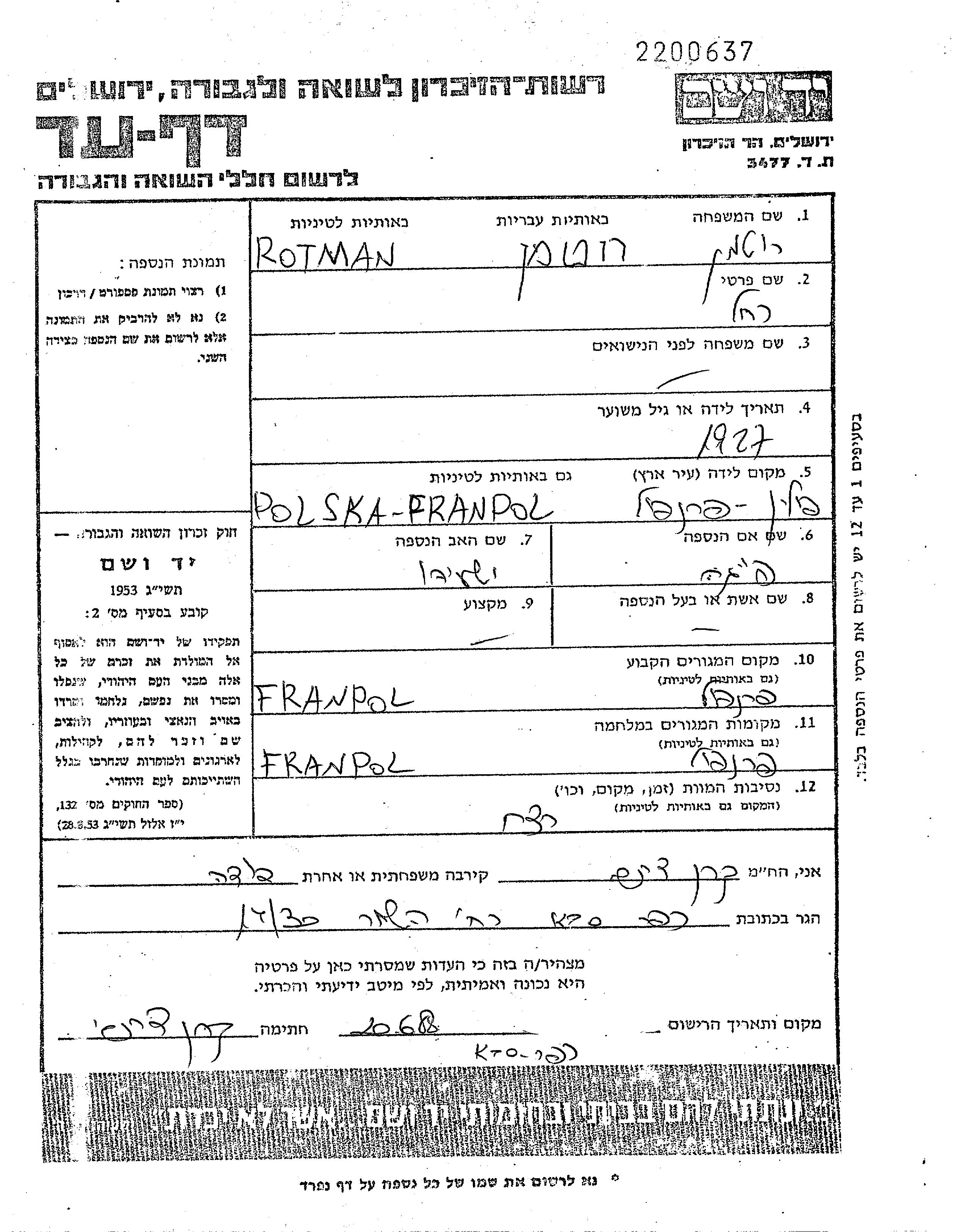 Rotman Rakhel 1927 Frampol, Pologne Feuille de témoignage