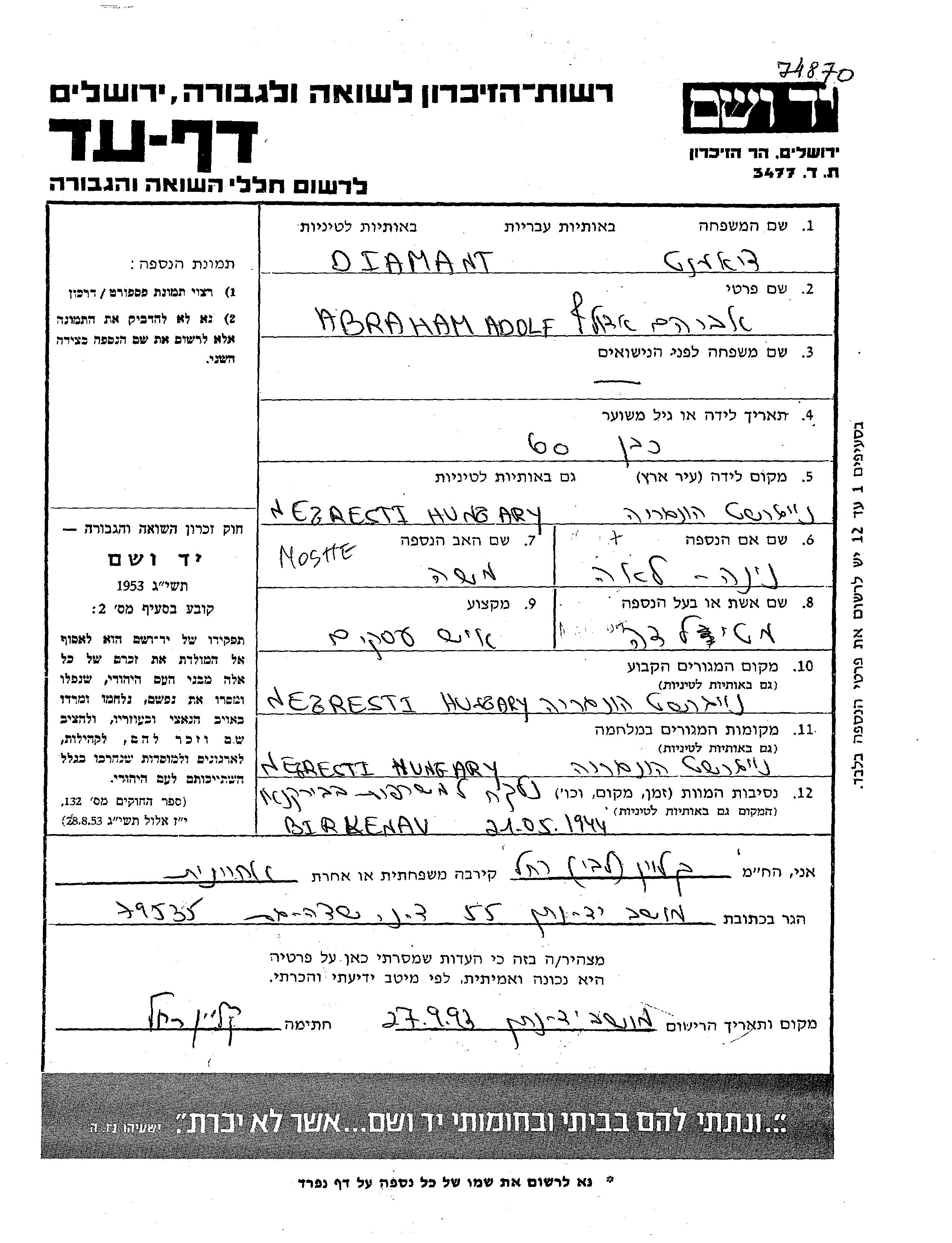 Abraham Adolf Diamant est né à Negresti Oas, Roumanie en 1884, fils de Moshe et de Nina Lea. Il était Homme d'affaire et Mariée à Matilda. Avant la seconde guerre mondiale il vivait à Negresti Oas, Roumanie. Au cours de la guerre, il était à Negresti Oas, Roumanie.