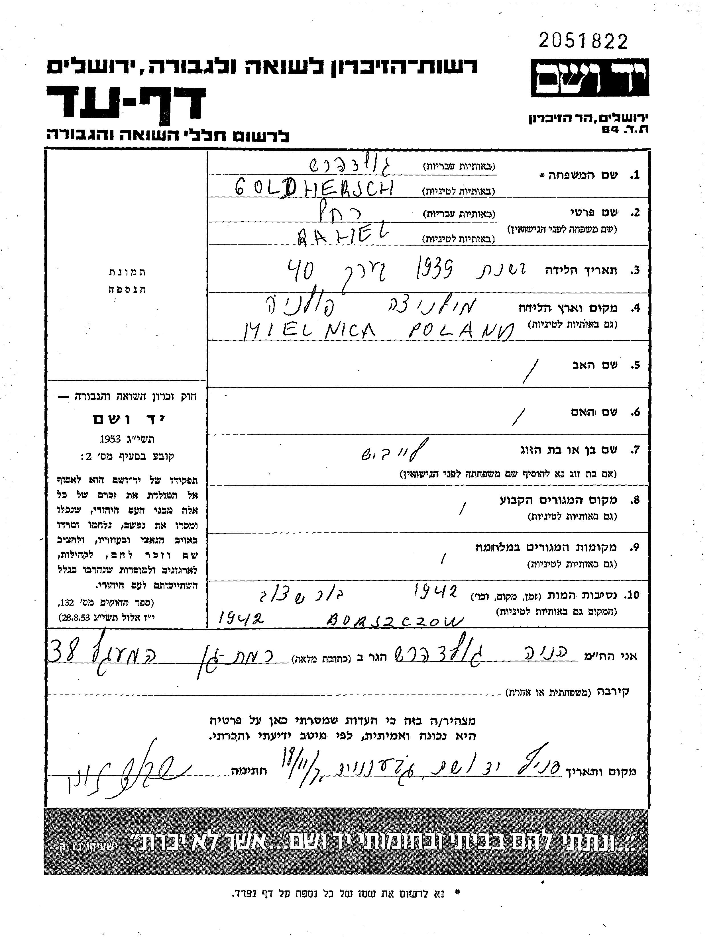 Goldhersch Rahel 1899 endroit inconnu, Feuille de témoignage