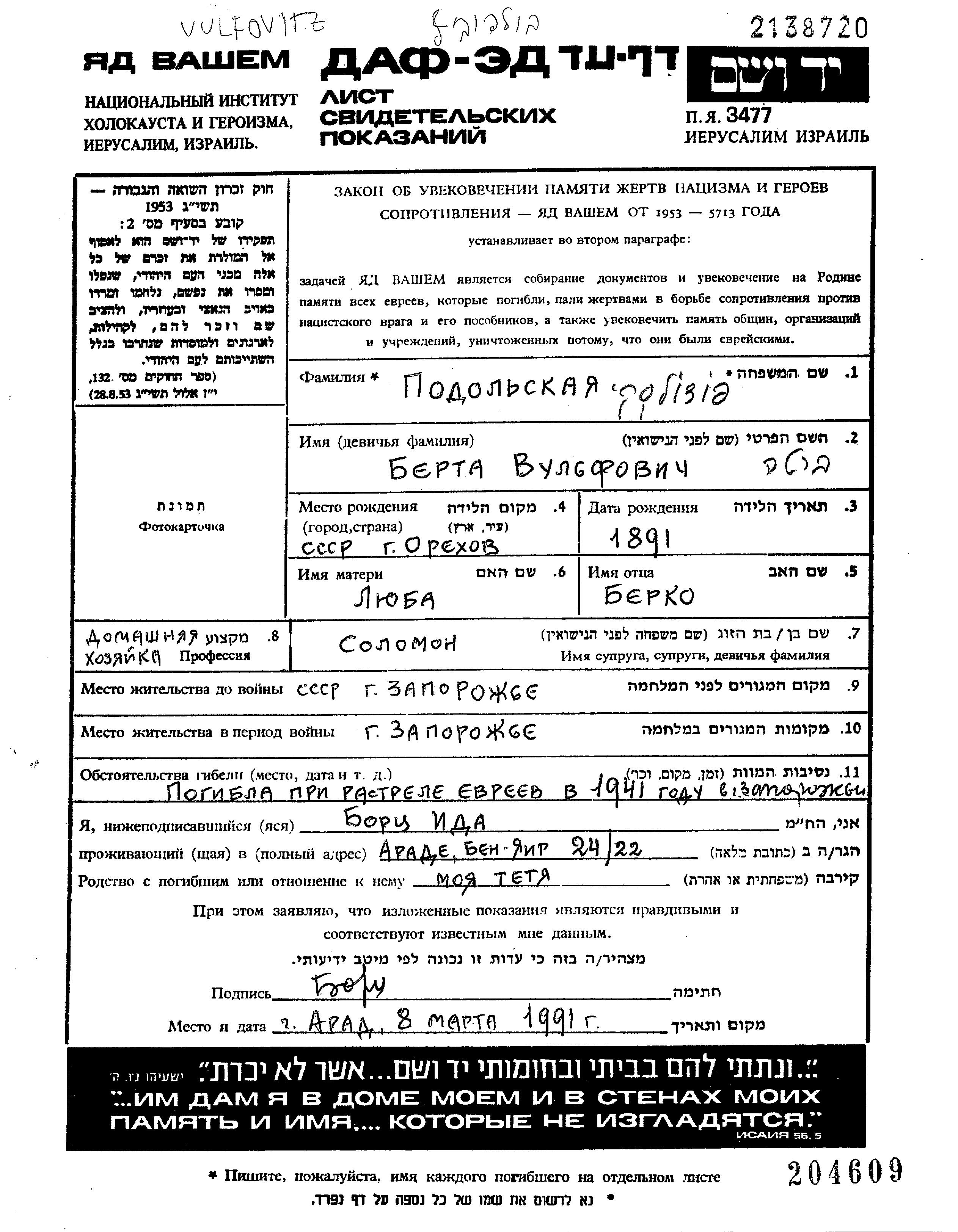 Berta Podolski née Vulfovich est née à Orekhov, Ukraine (URSS), fille de Berko et de Lyuba. Elle était Femme au foyer et Mariée à Solomon. Avant la seconde guerre mondiale elle vivait à Zaporozhye, Ukraine (URSS). Pendant la guerre, elle était à Zaporozhye, Ukraine (URSS).