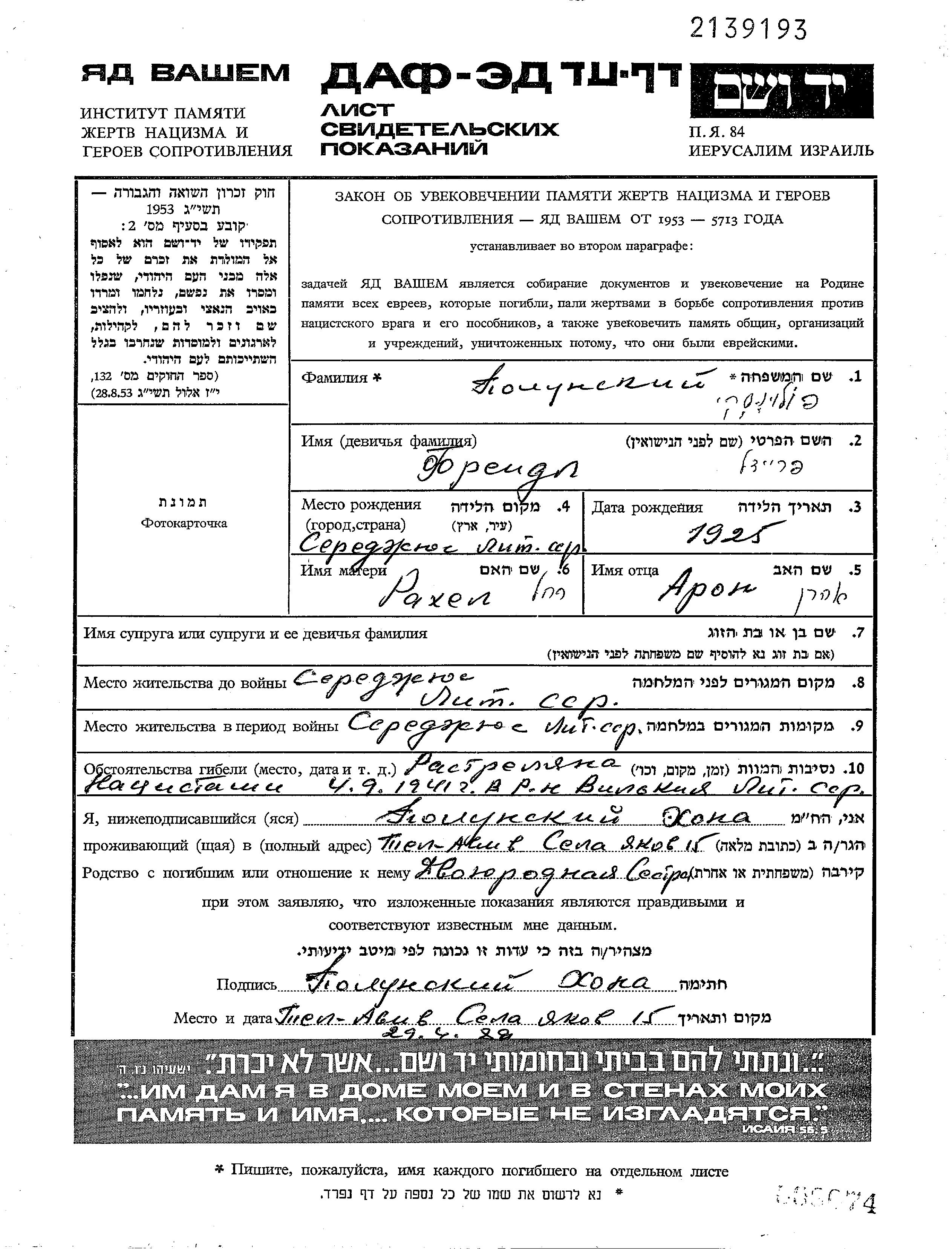 Polonski Freidl Freidel Seredzius, Lituanie Feuille de témoignage