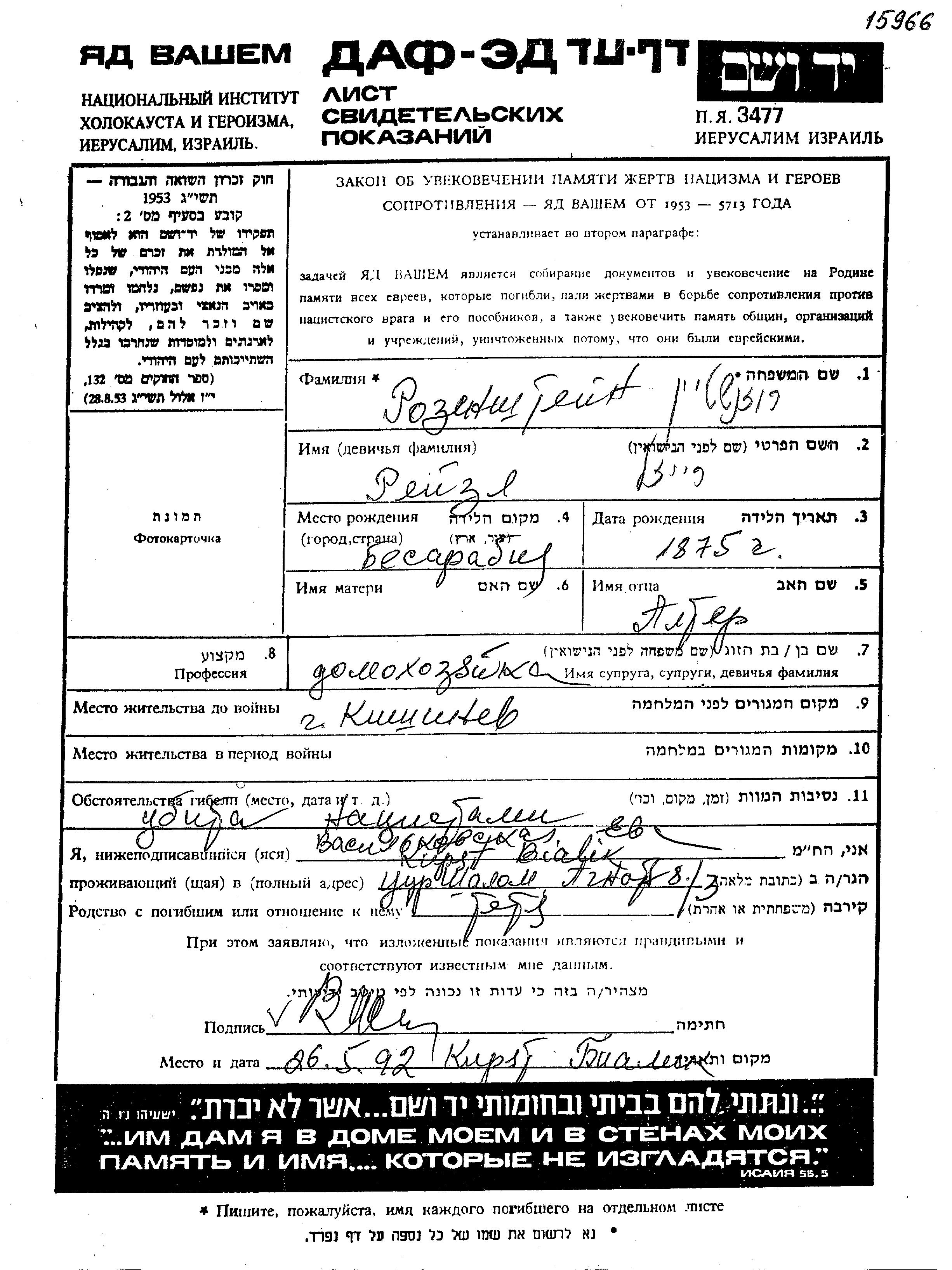 Rozenshtein Reizl 1875 Kishinev, Roumanie Feuille de témoignage