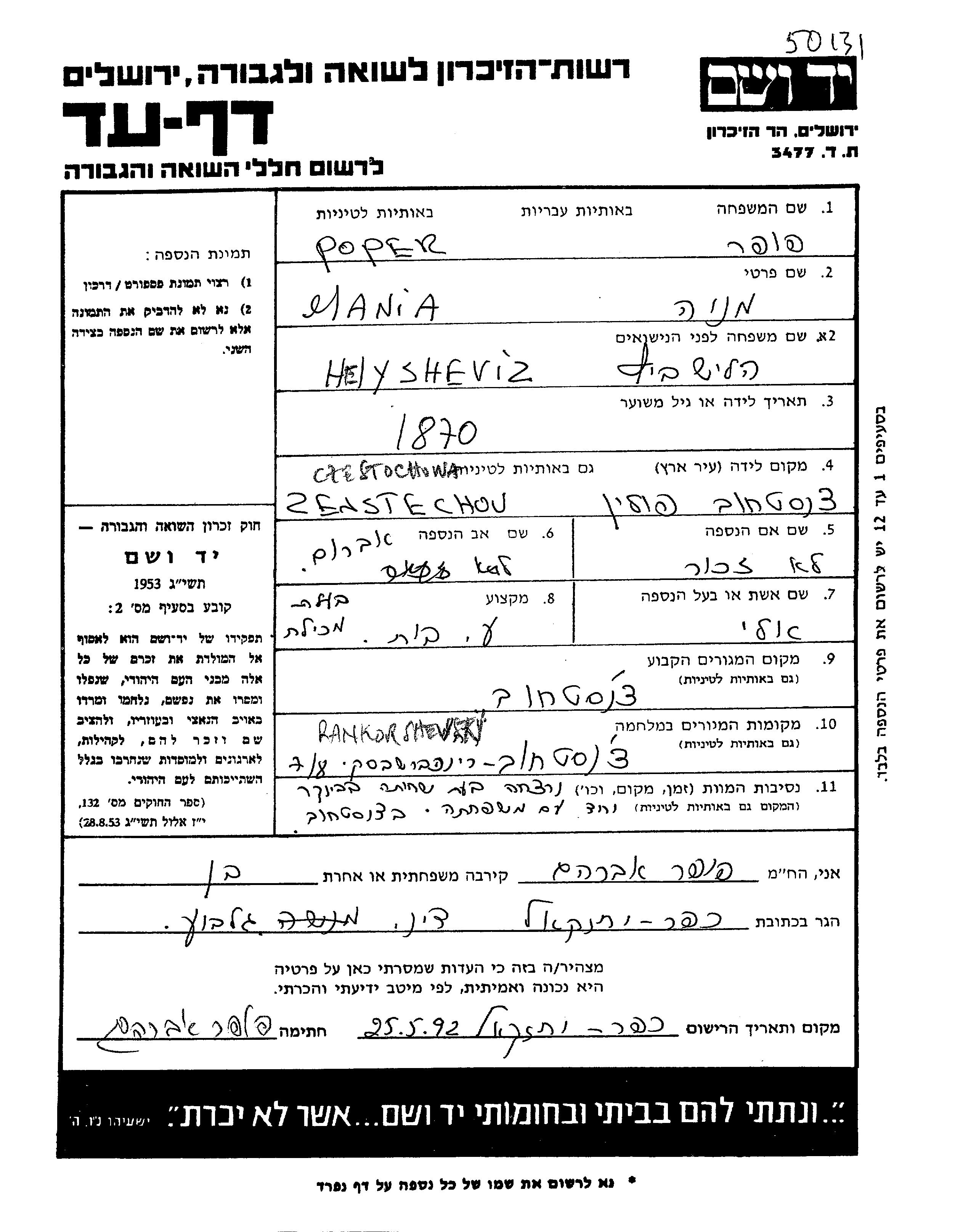 Mania Poper née Helysheviz Helishevitz est née à Czestochowa, Pologne en 1870, fille de Abraham. Elle était Femme au foyer et Mariée à Eli. Avant la seconde guerre mondiale elle vivait à Czestochowa, Pologne. Pendant la guerre, elle était à Czestochowa, Pologne.