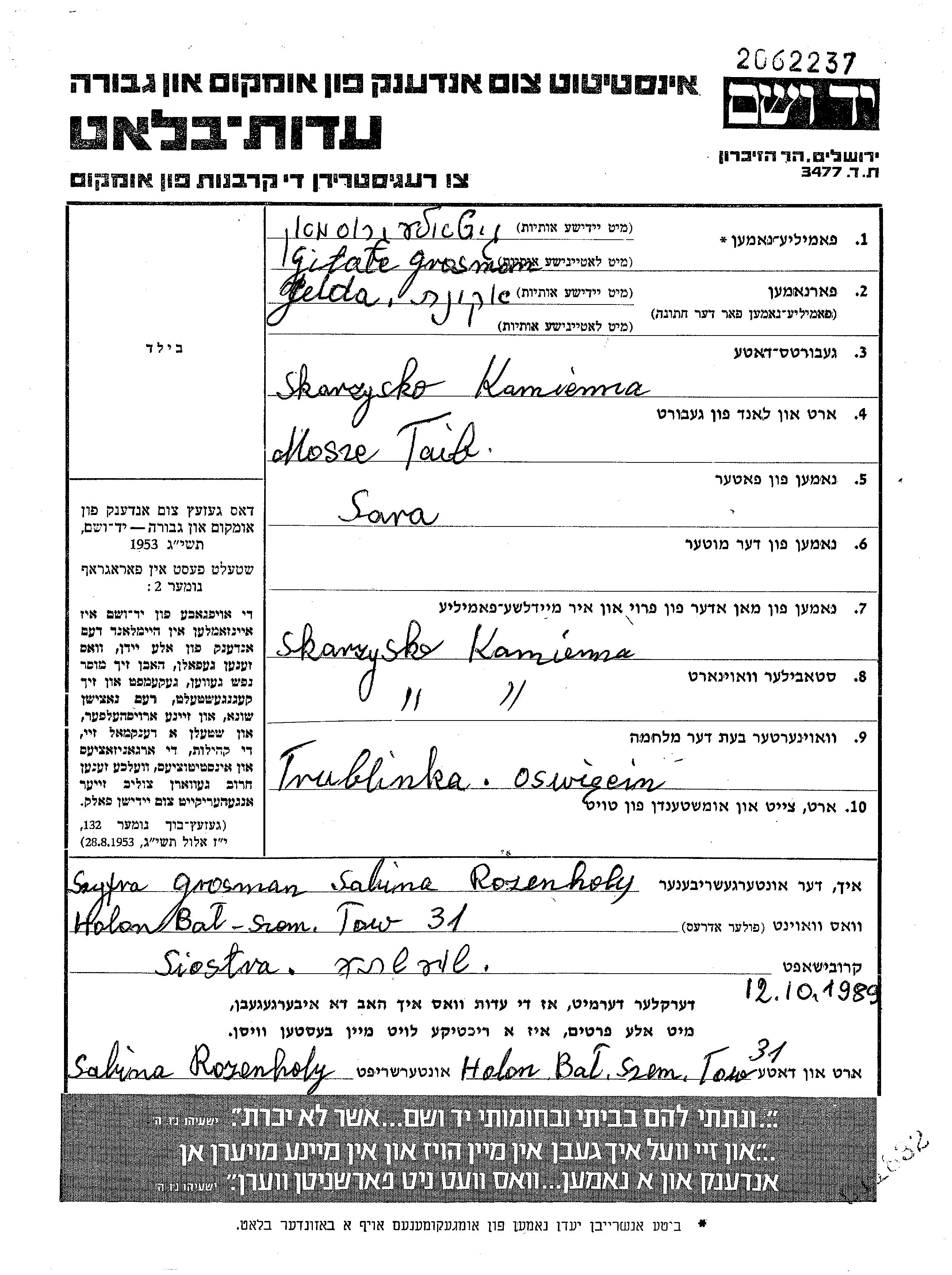 Grosman Gitale Zelda Skarzysko Kamienna, Pologne Feuille de témoignage