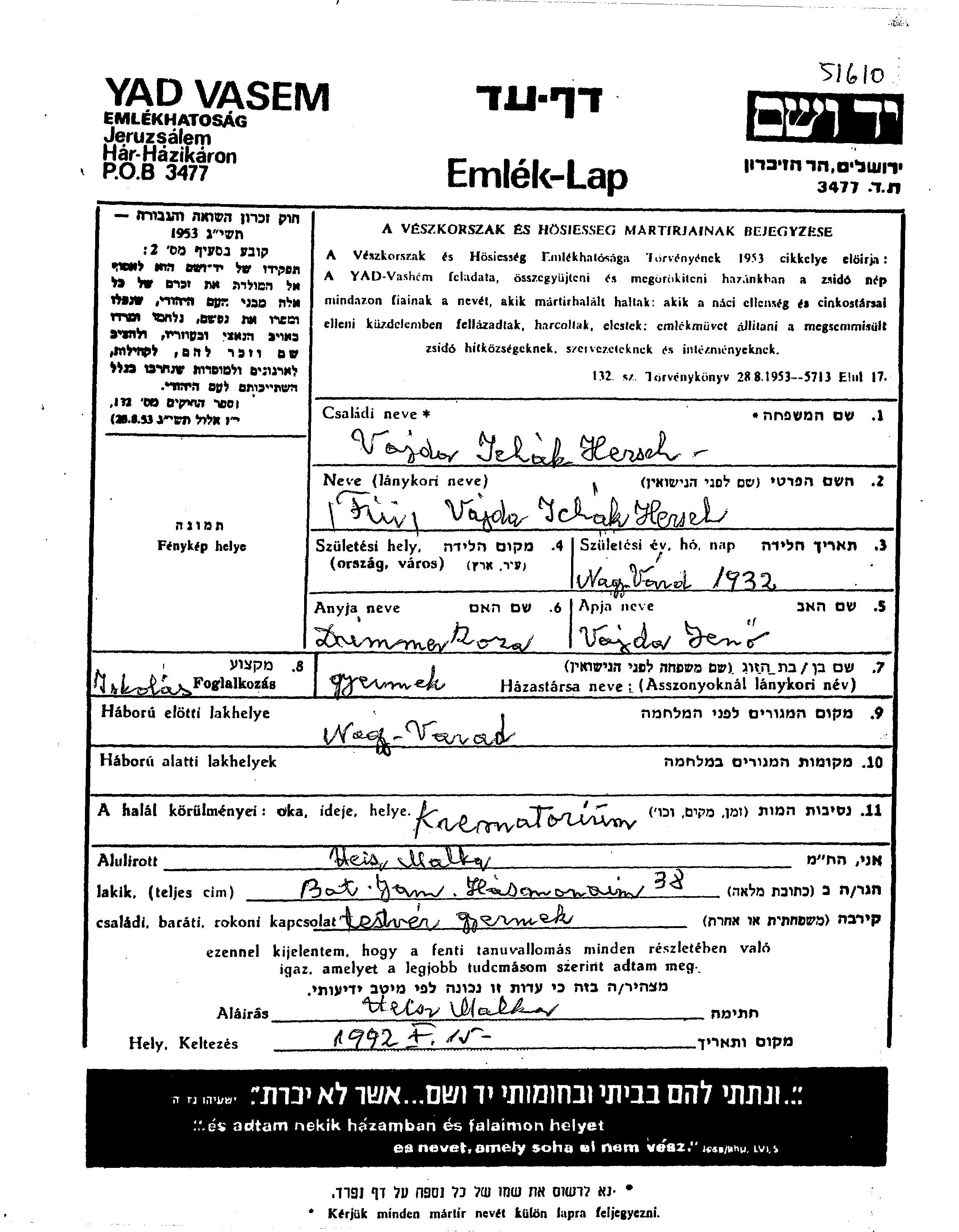 Ichak Hersch Vajda est né à Nagyvarad, Roumanie en 1932, fils de Jeno et de Rozsi née Drimmer. Il était Élève et Enfant. Avant la seconde guerre mondiale il vivait à Nagyvarad, Roumanie. Au cours de la guerre, il était à Nagyvarad, Roumanie.