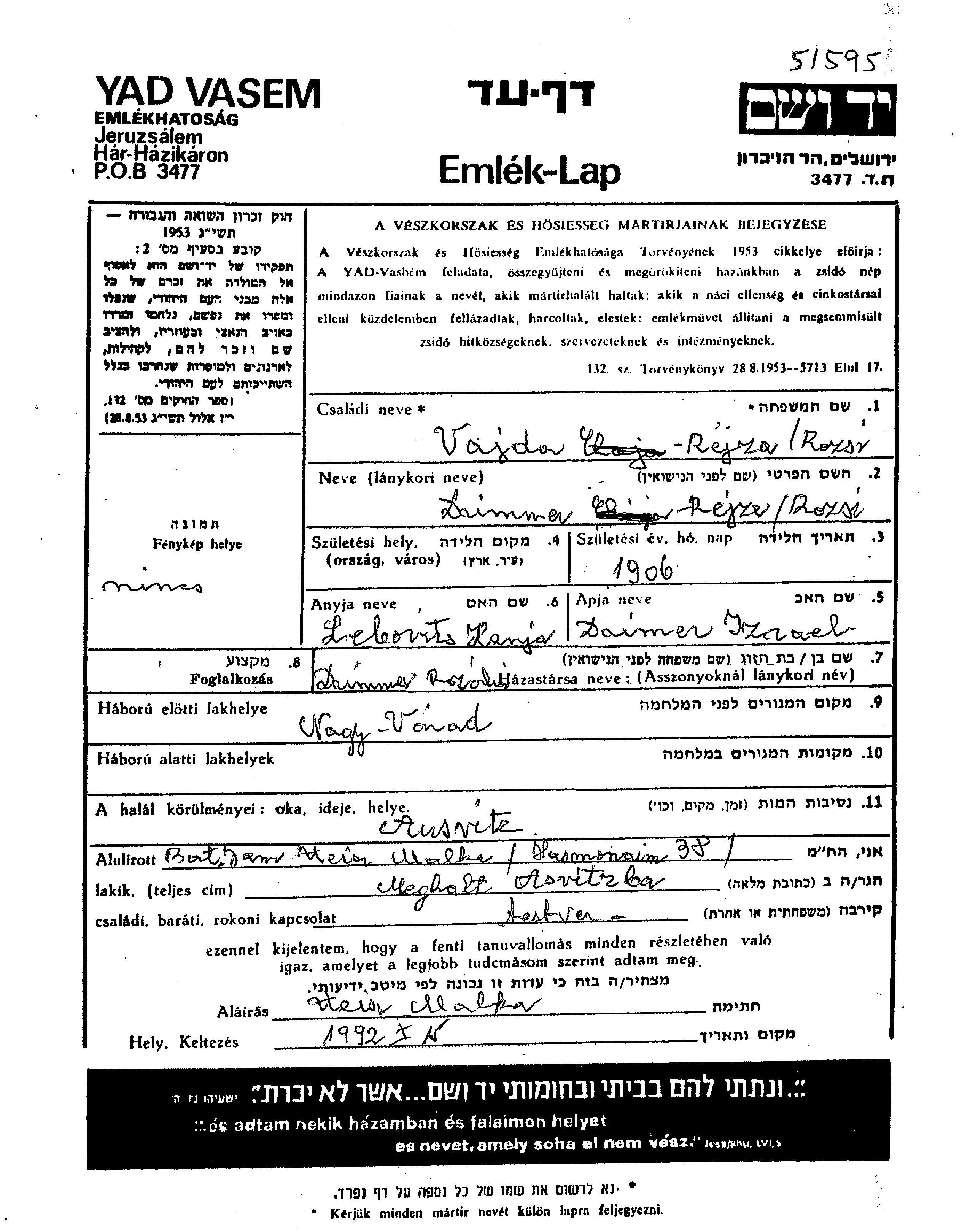 Vajda Rozsi 1906 Nagyvarad, Roumanie Feuille de témoignage