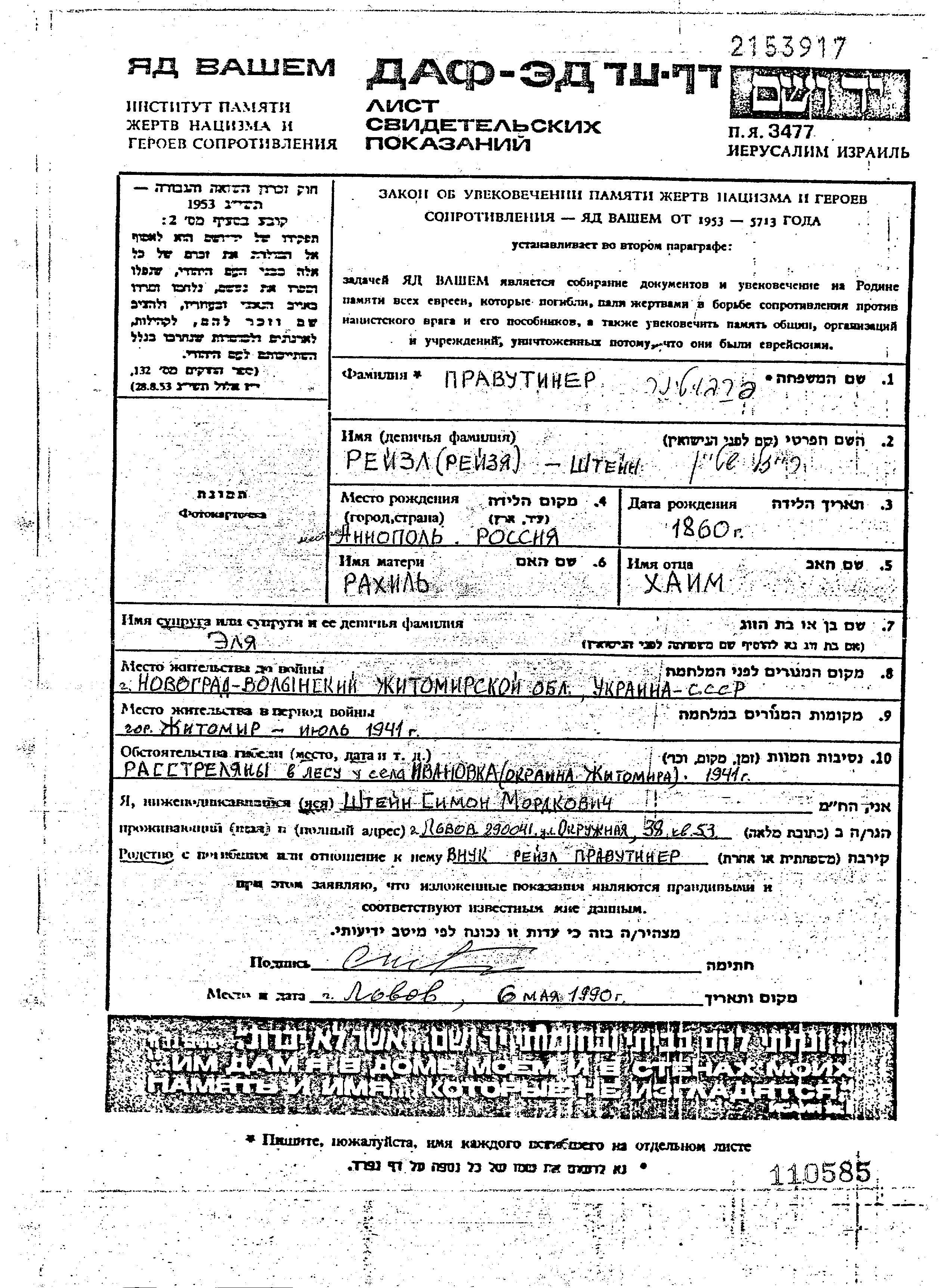 Pravutiner Reizl 1860 Novograd Volynsk, Ukraine (URSS) Feuille de témoignage