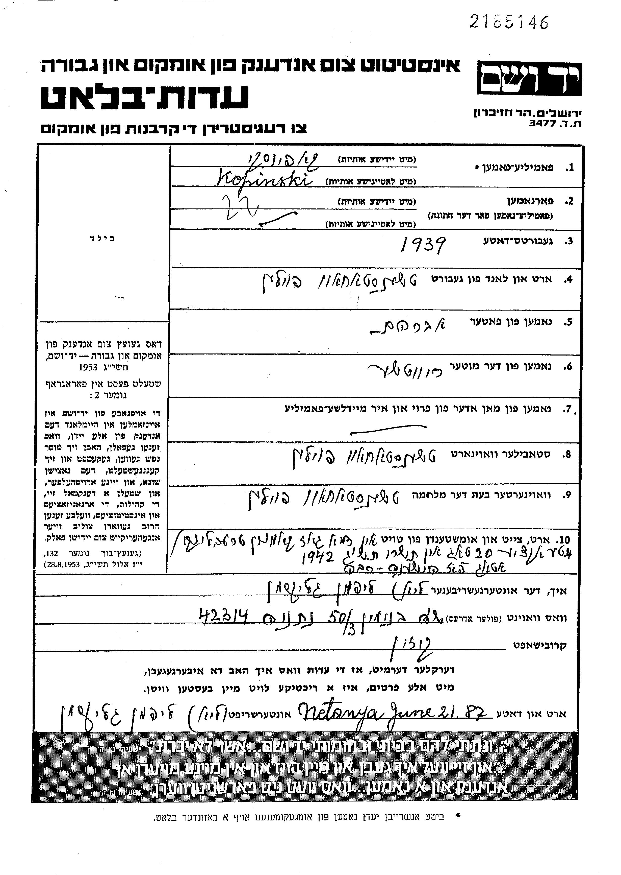 Kopinski prénom inconnu 1939 Czestochowa, Pologne Feuille de témoignage