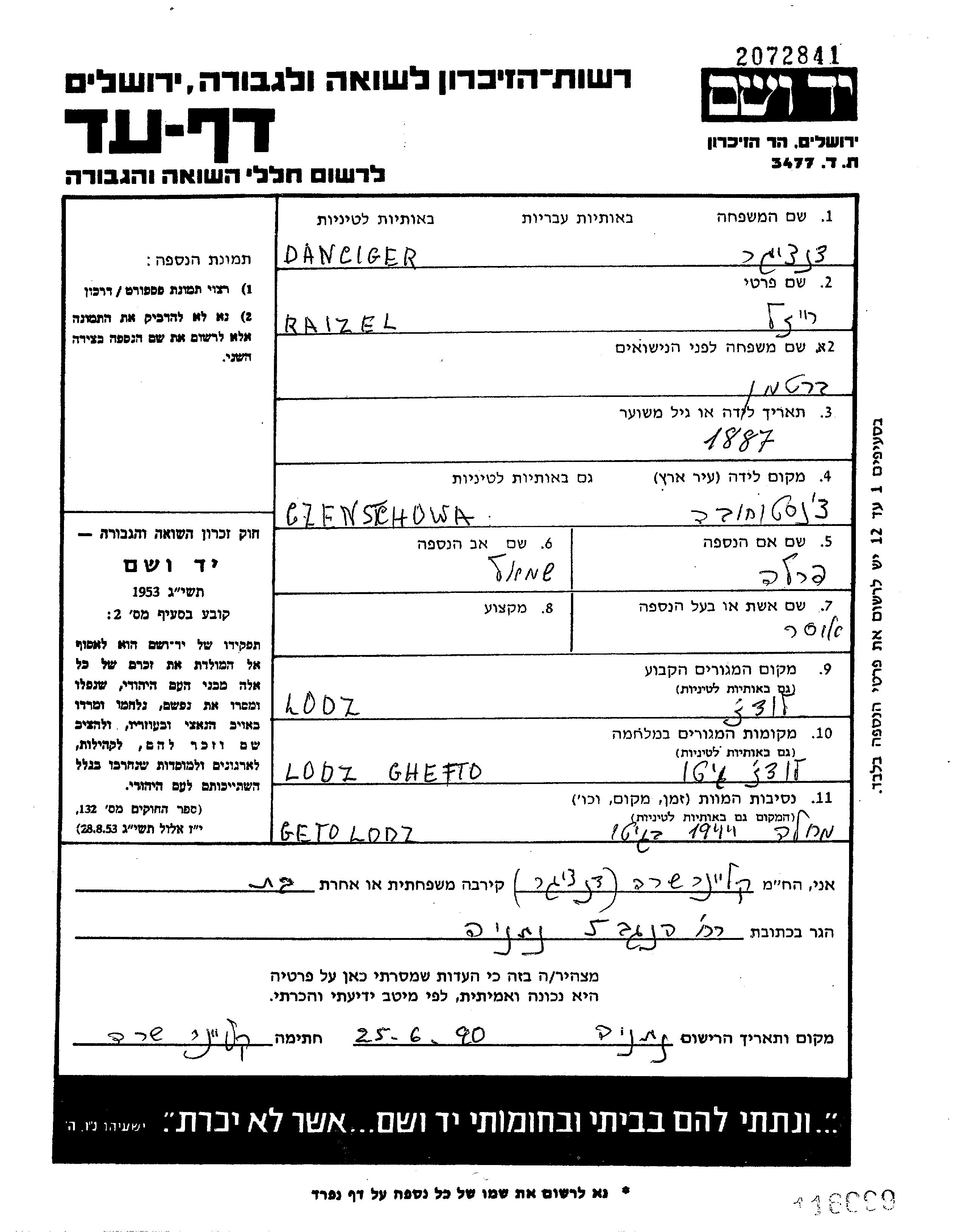 Danciger Raizel Lodz, Pologne Feuille de témoignage