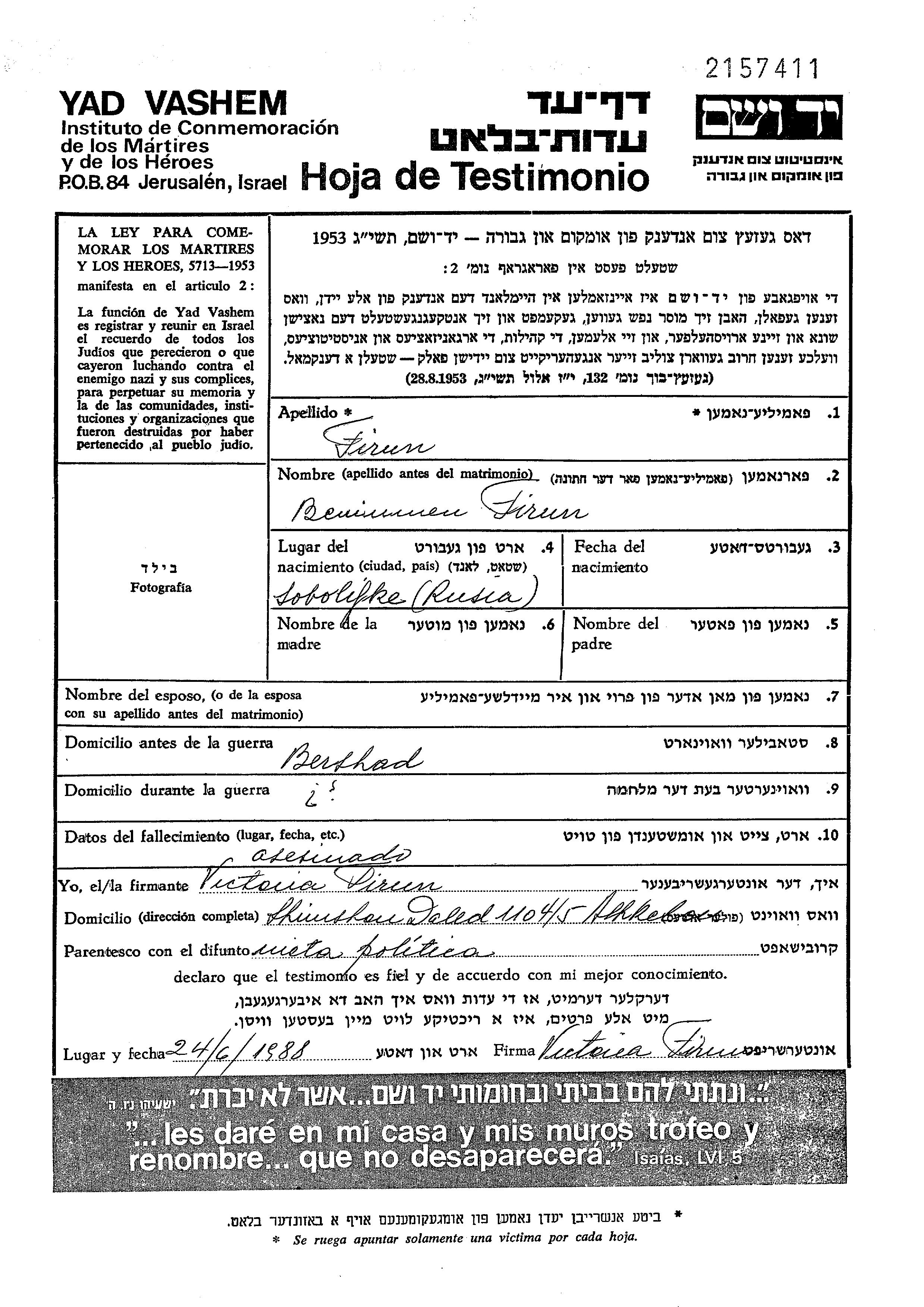 Firun Pieron Beniumen Bershad, Ukraine (URSS) Feuille de témoignage