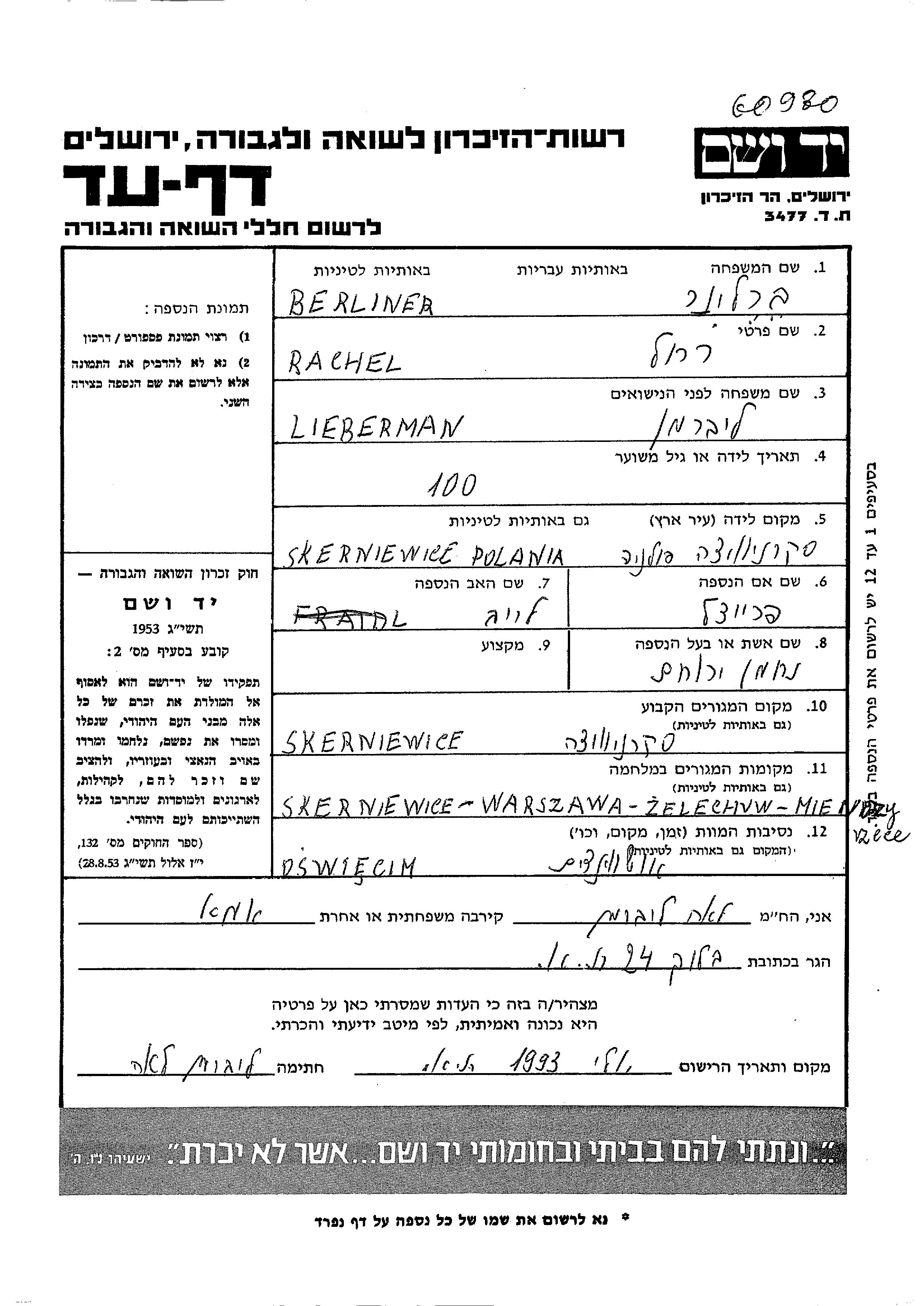 Rachel Berliner née Lieberman est née à Skierniewice, Pologne, fille de Leib et de Freidel Freidel. Elle était Mariée à Nakhman Yerukham. Avant la seconde guerre mondiale elle vivait à Skierniewice, Pologne. Pendant la guerre, elle était à Miedzyrzec, Pologne.