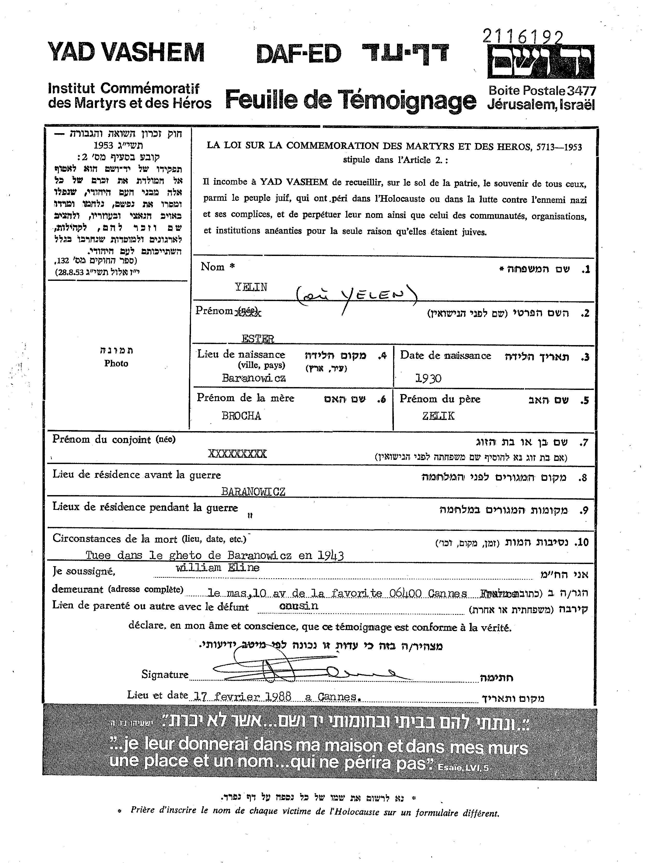 Yelin Ester 1930 Baranowicze, Pologne Feuille de témoignage
