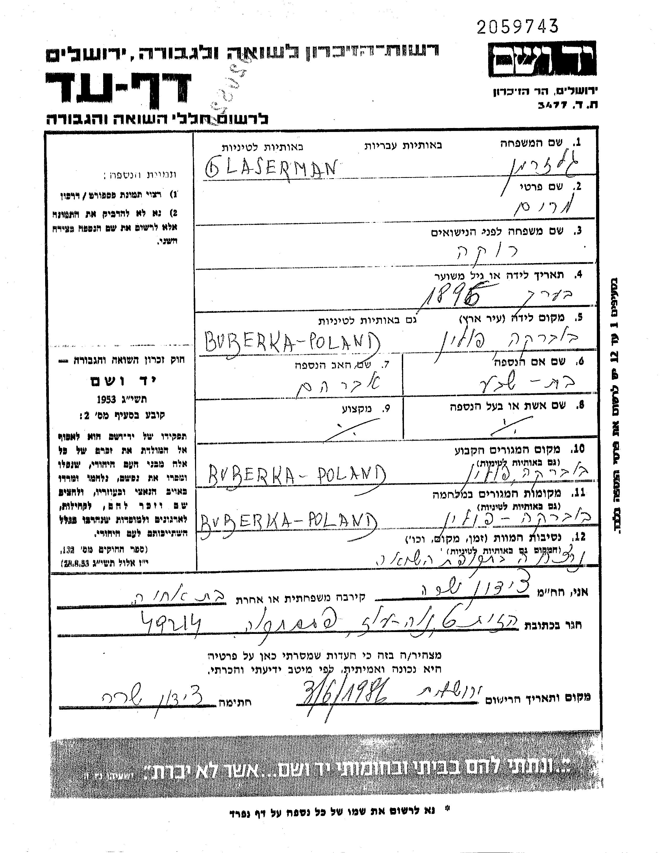 Glaserman Miriam 1896 Bobrka, Pologne Feuille de témoignage