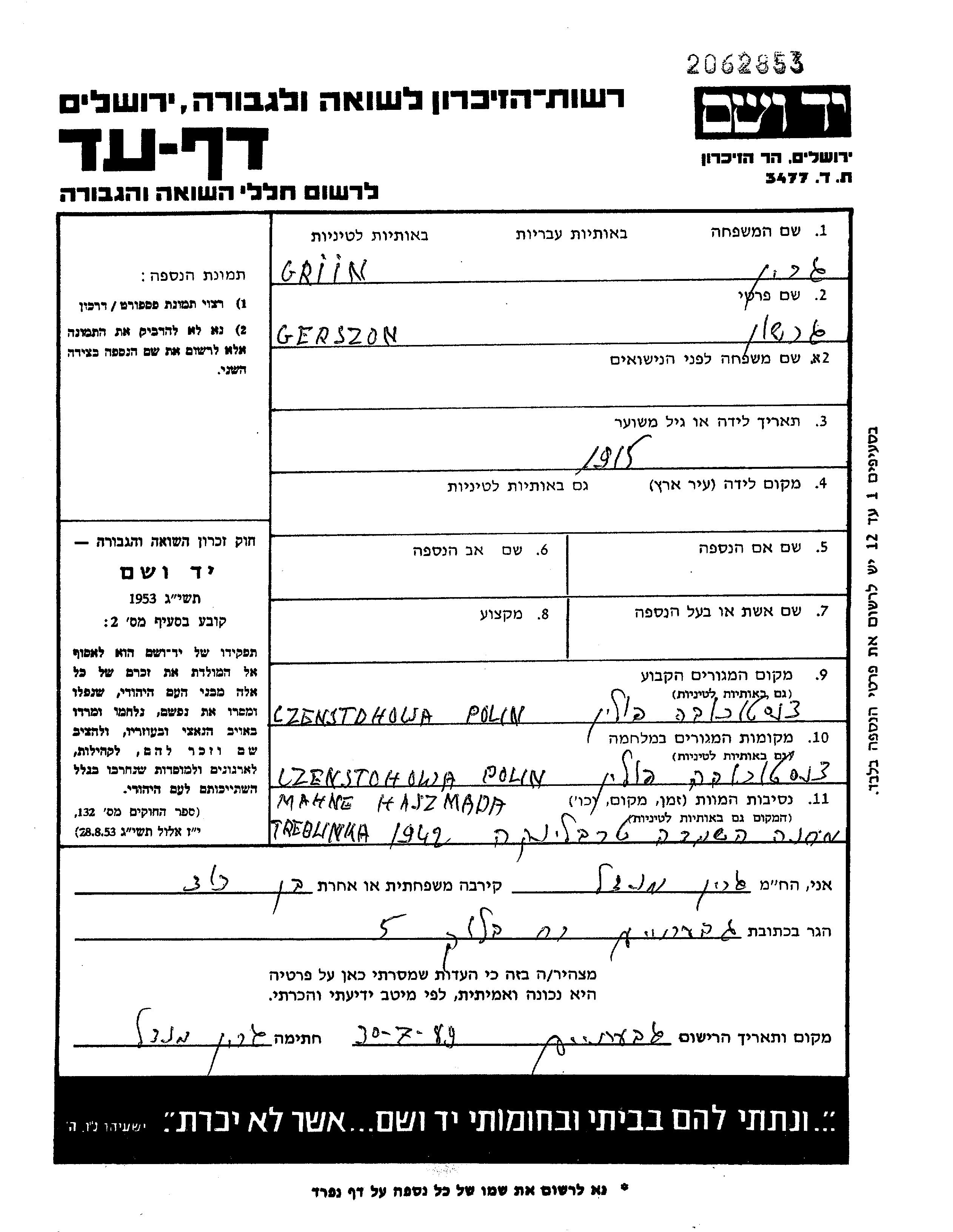 Griin Gerszon 1915 Czestochowa, Pologne Feuille de témoignage