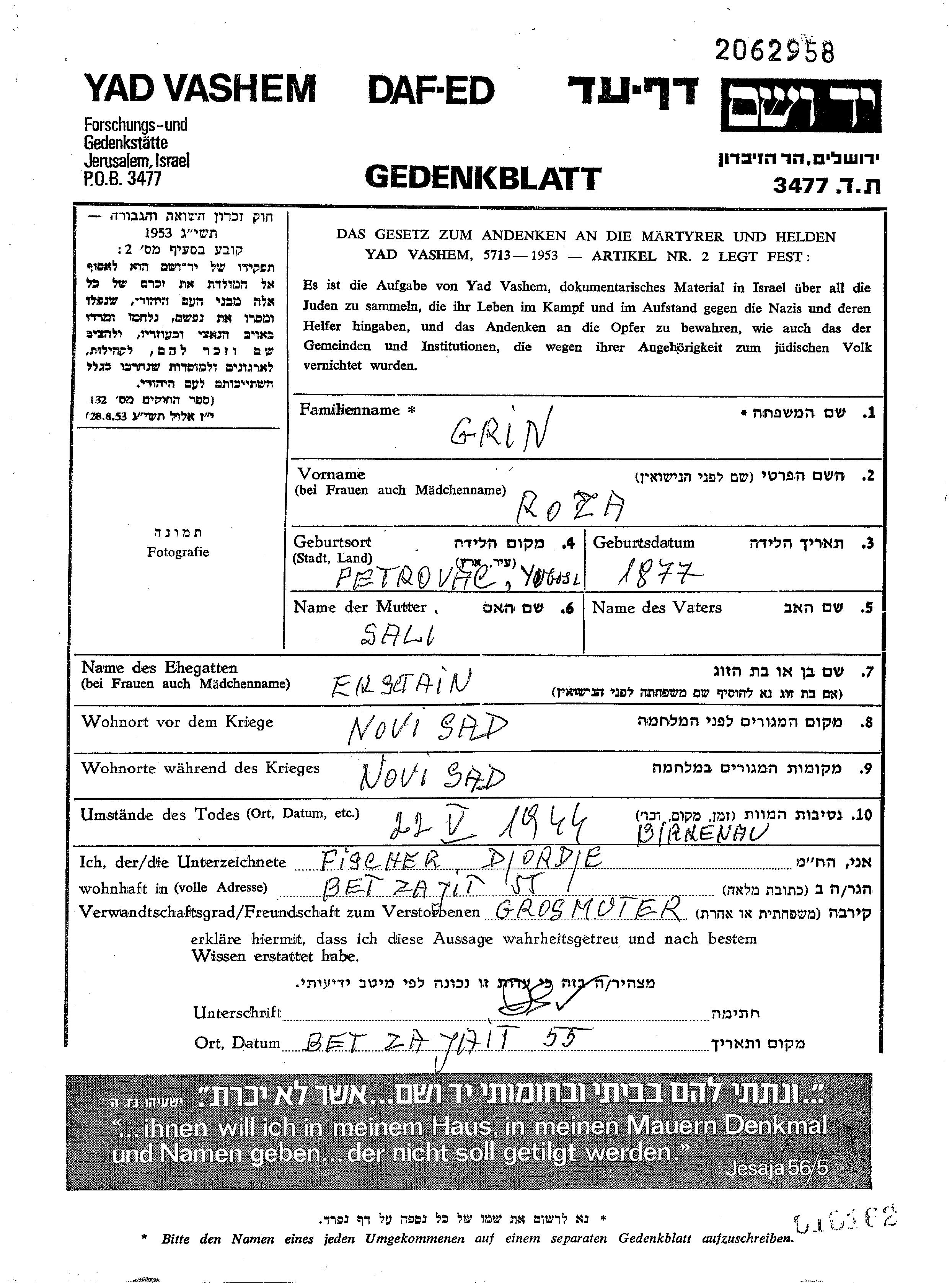 Roza Grin née Eksctain est née à Petrovac, Yugoslavie en 1877, fille de Sali Zali. Elle était Mariée. Avant la seconde guerre mondiale elle vivait à Novi Sad, Yugoslavie. Pendant la guerre, elle était à Novi Sad, Yugoslavie.