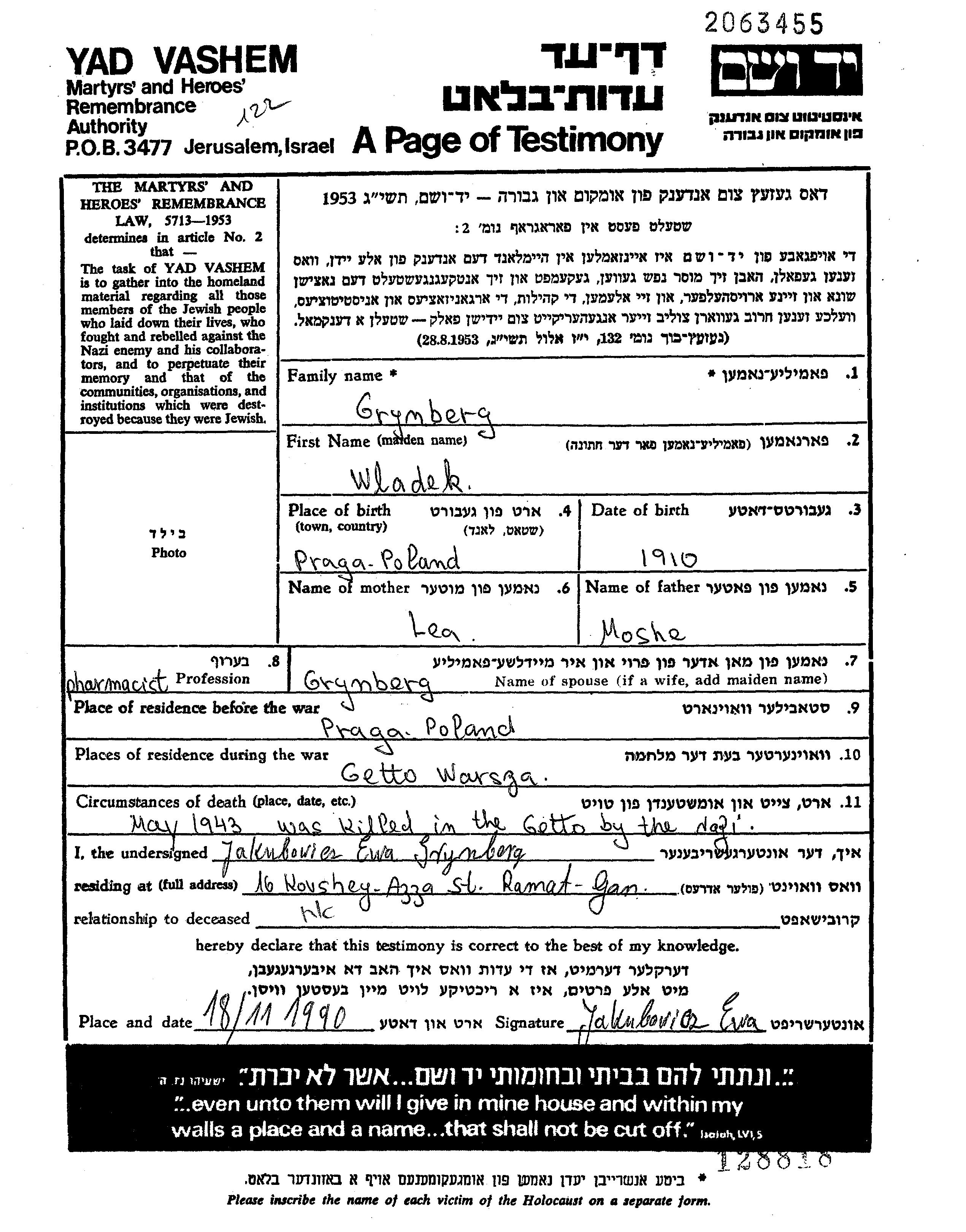 Grynberg Wladek 1910 Warszawa, Pologne Feuille de témoignage