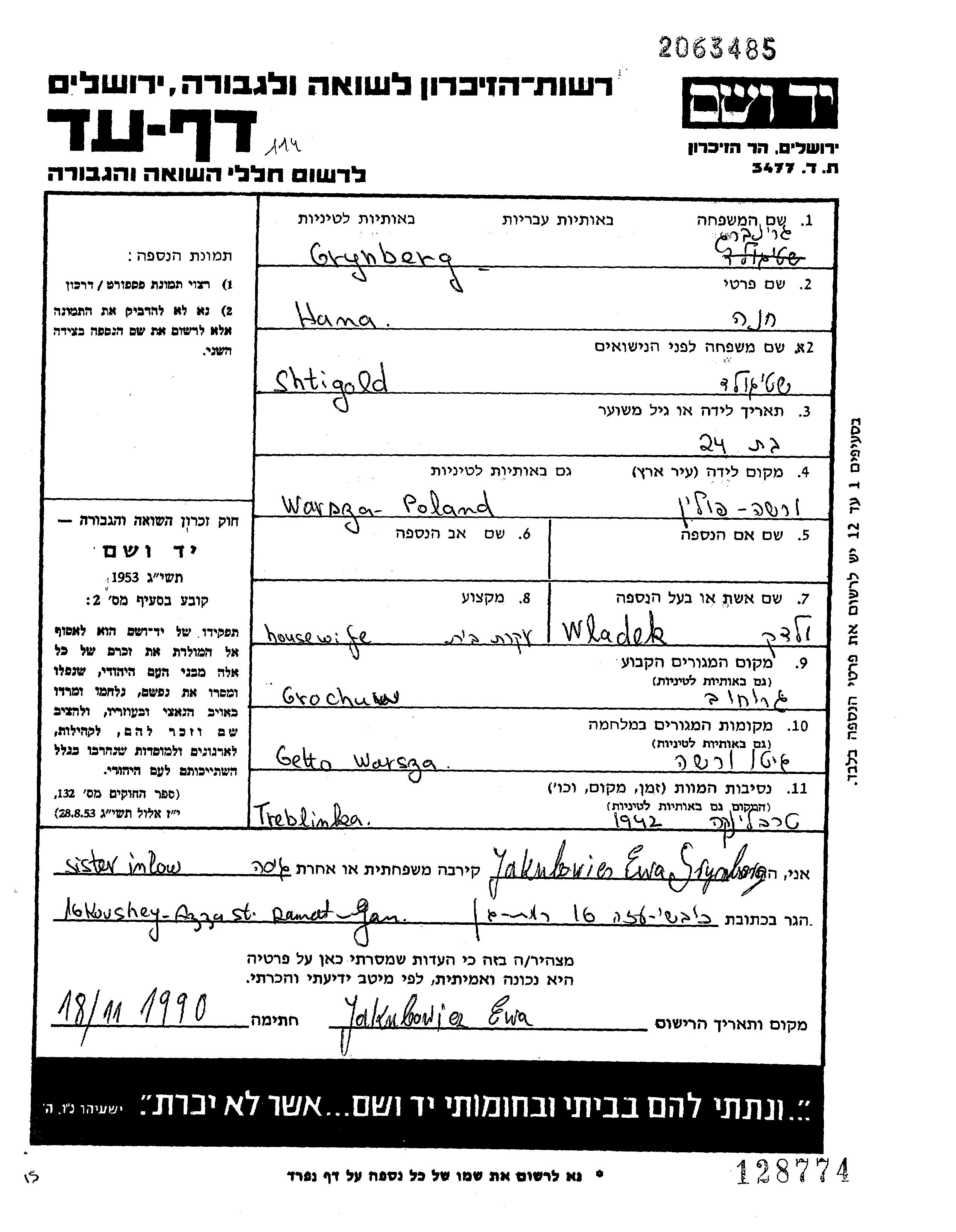 Grynberg Hana Grochow, Pologne Feuille de témoignage