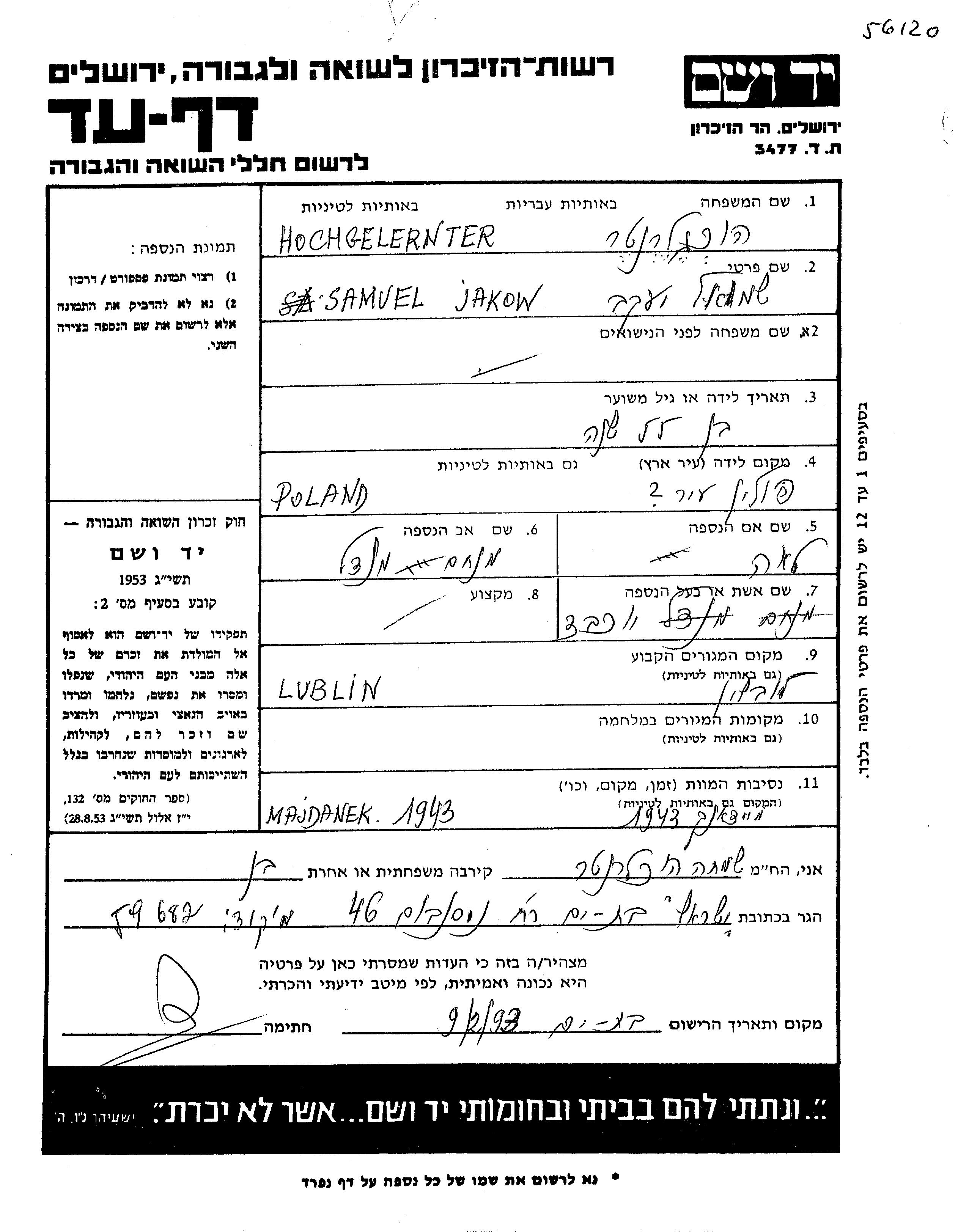 Szmuel Jakow Hochgelernter est né à Pologne en 1888, fils de Menachem Mendel et de Lea. Il était Mariée à Yoheved. Avant la seconde guerre mondiale il vivait à Lublin, Pologne. Au cours de la guerre, il était à Lublin, Pologne.