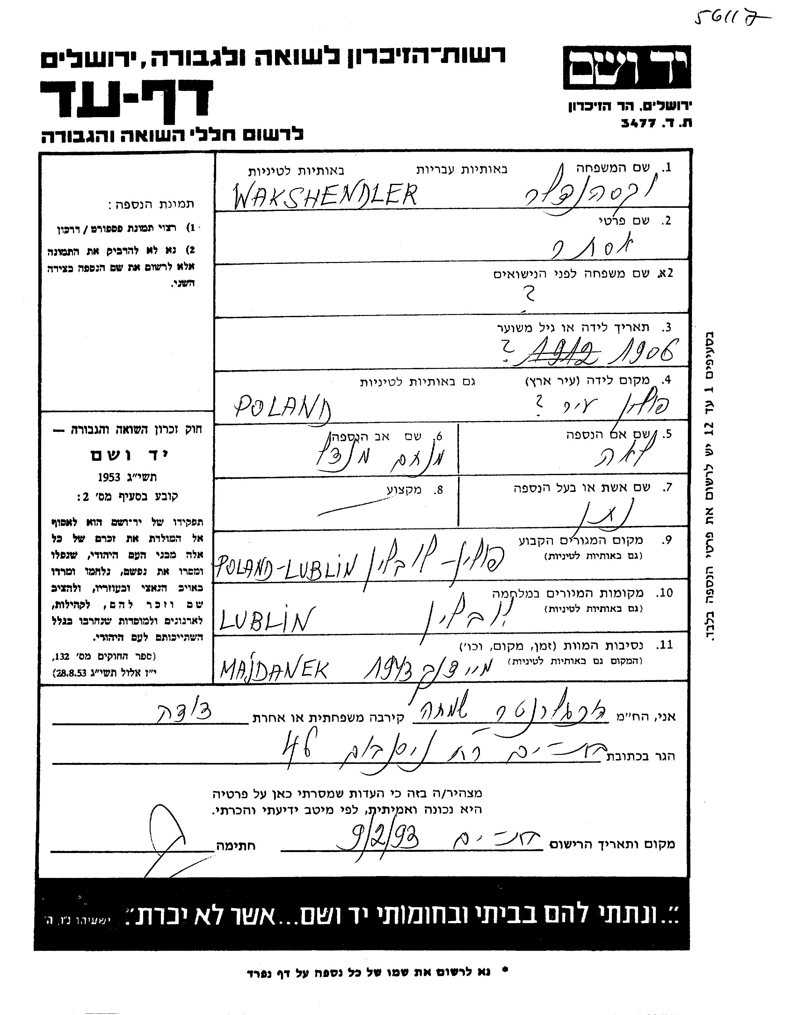 Wakshendler Esther 1906 Lublin, Pologne Feuille de témoignage
