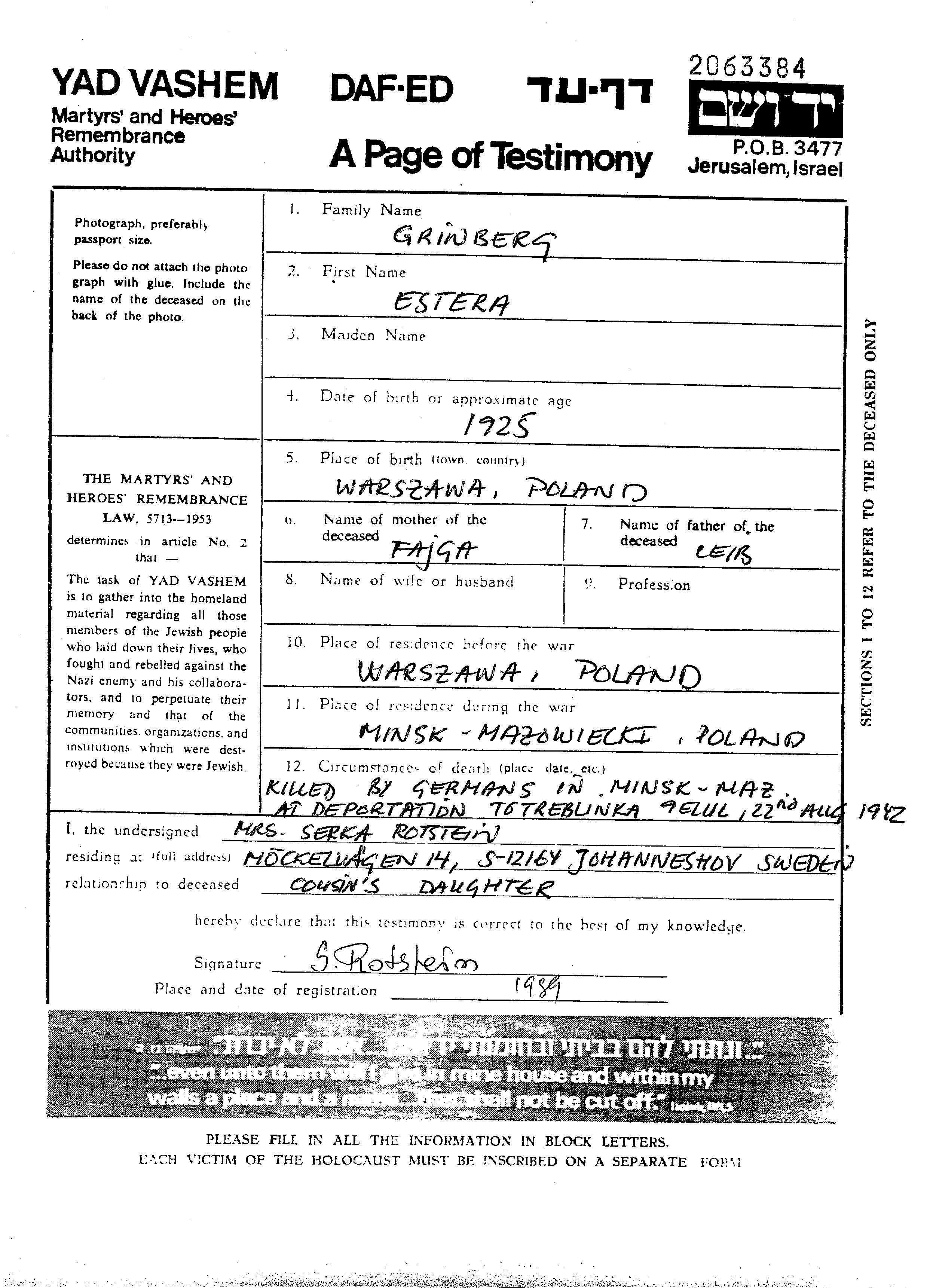 Grinberg Estera 1925 Warszawa, Pologne Feuille de témoignage
