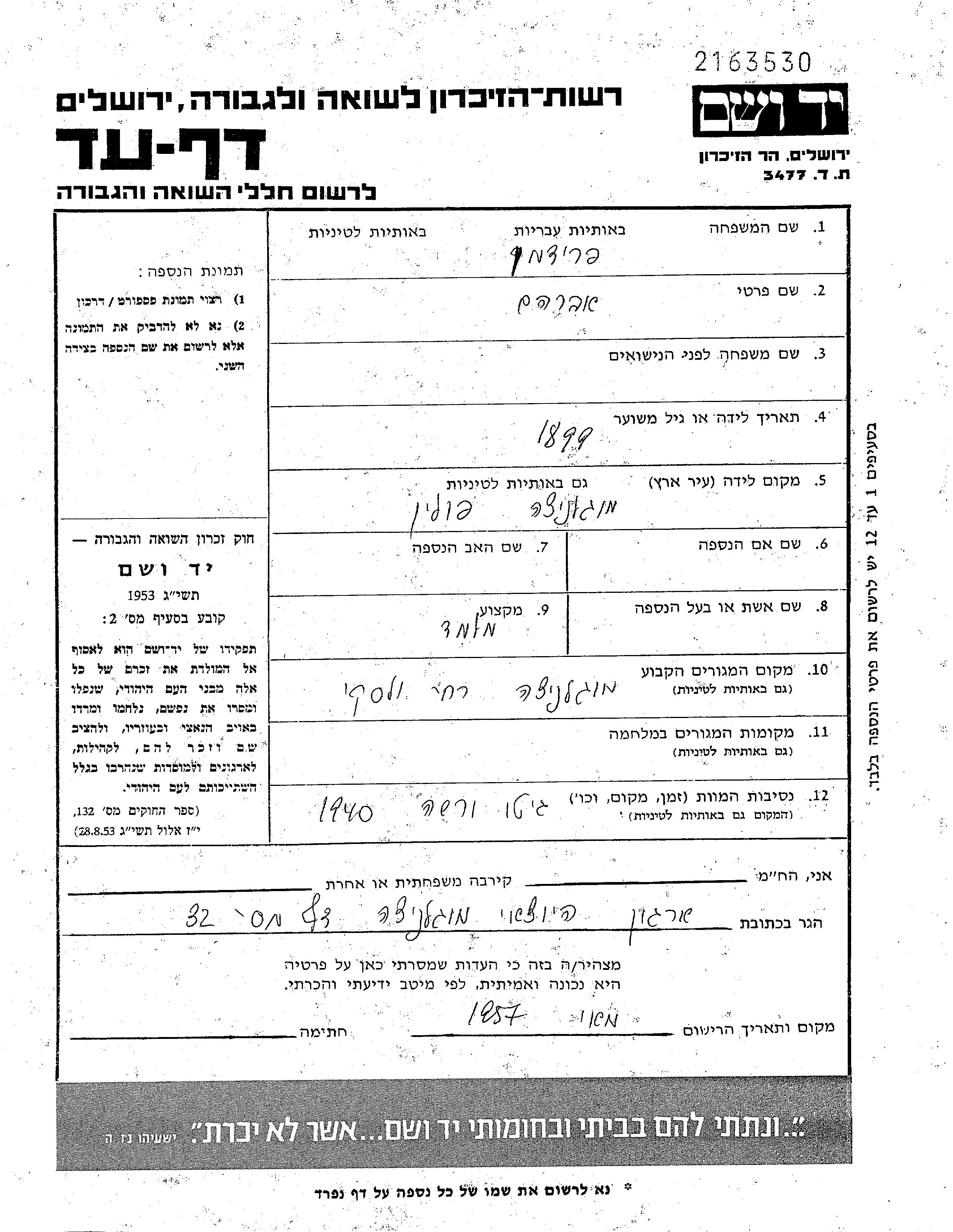 Fridman Abraham 1899 Mogielnica, Pologne Feuille de témoignage