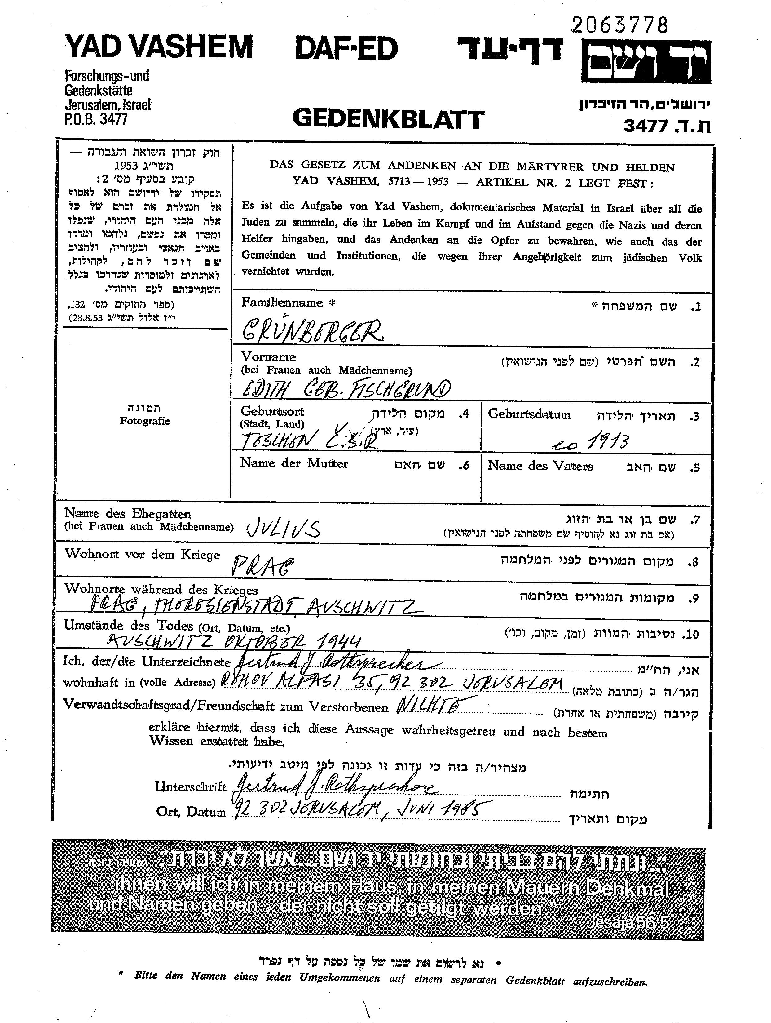 Gruenberger Edith 1913 Prague, Tchécoslovaquie Feuille de témoignage