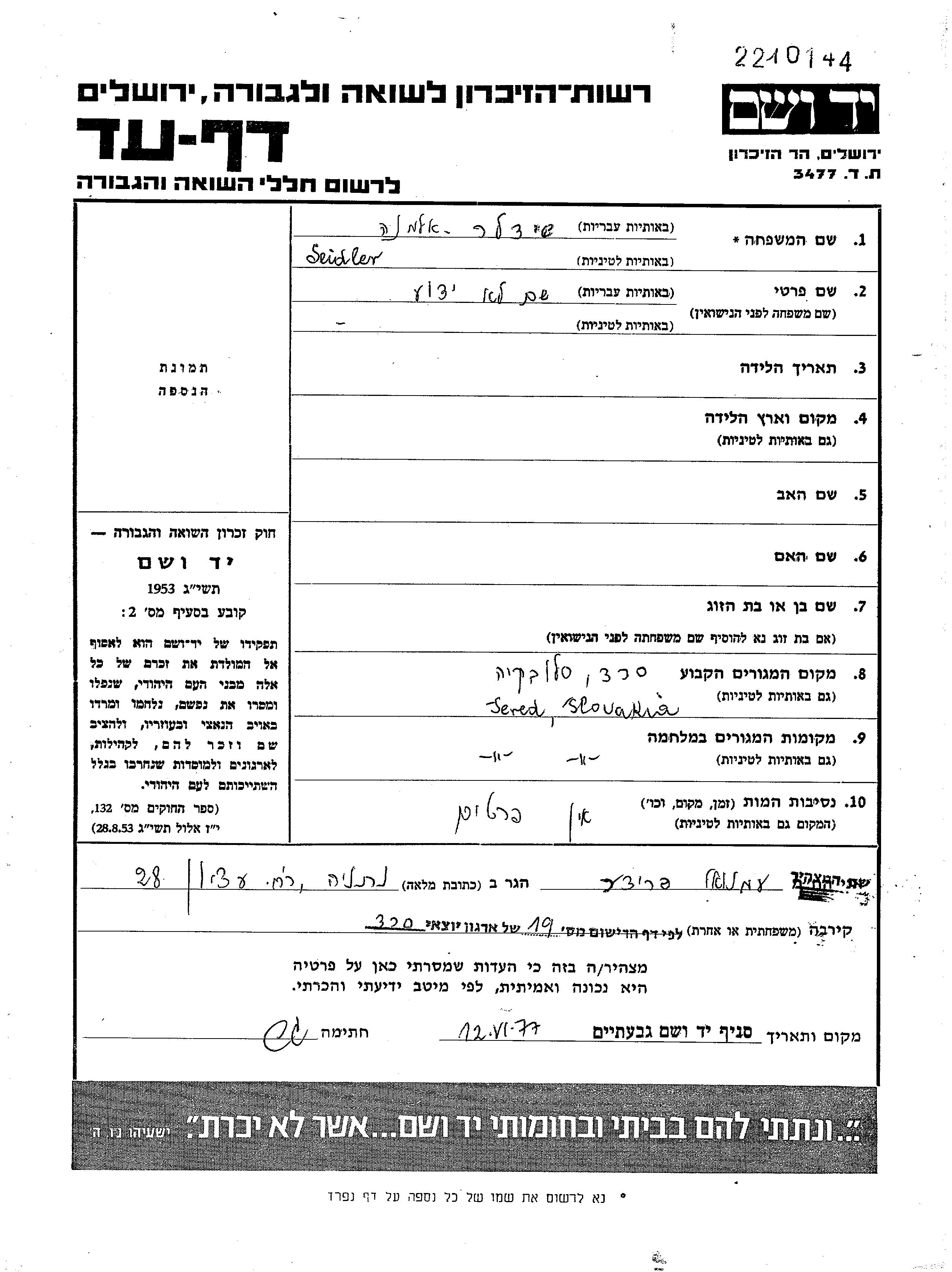 Seidler Shidler prénom inconnu Sered nad Vahom, Tchécoslovaquie Feuille de témoignage