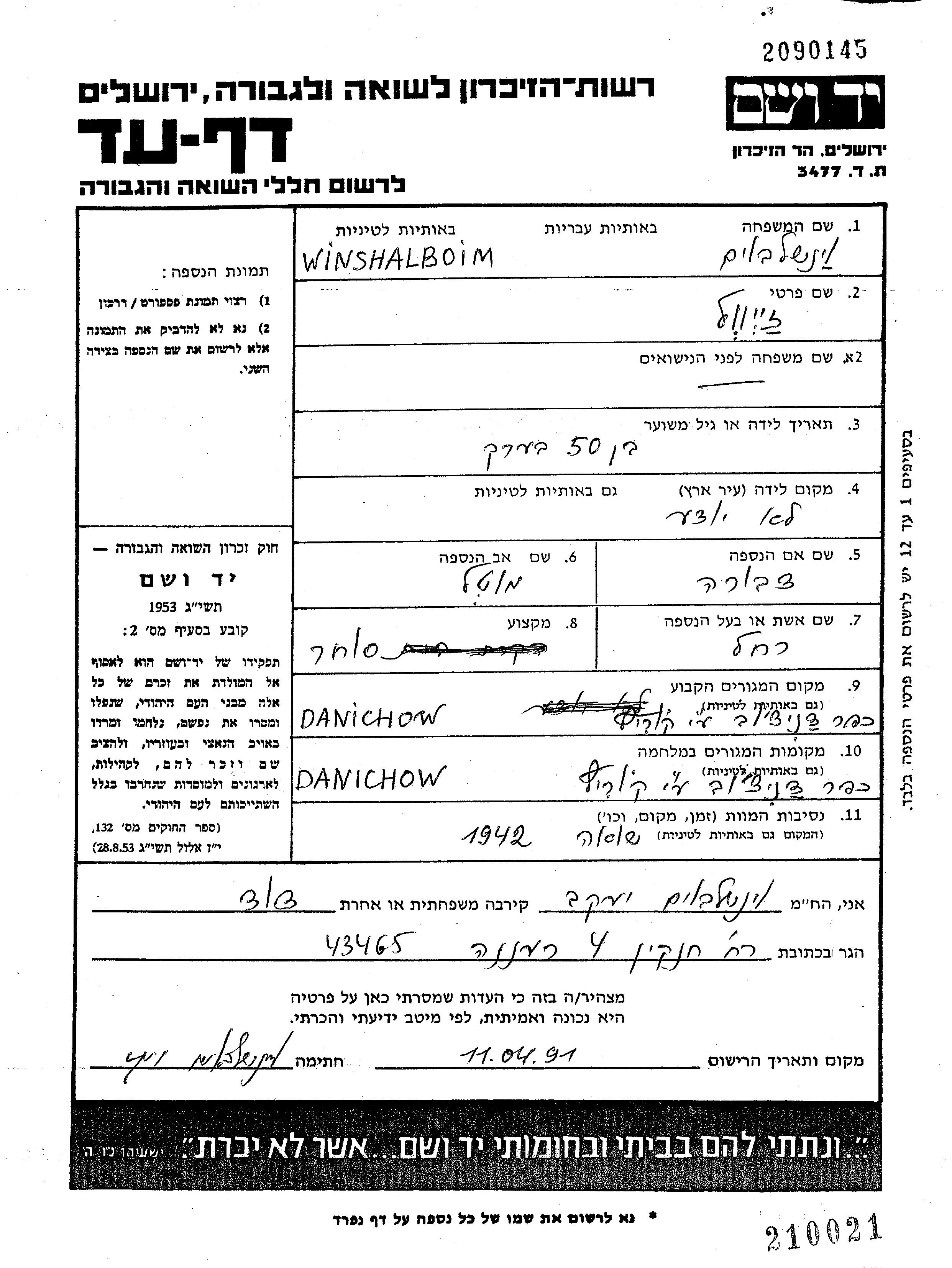 Winshalboim Zaivel Daniczow, Pologne Feuille de témoignage