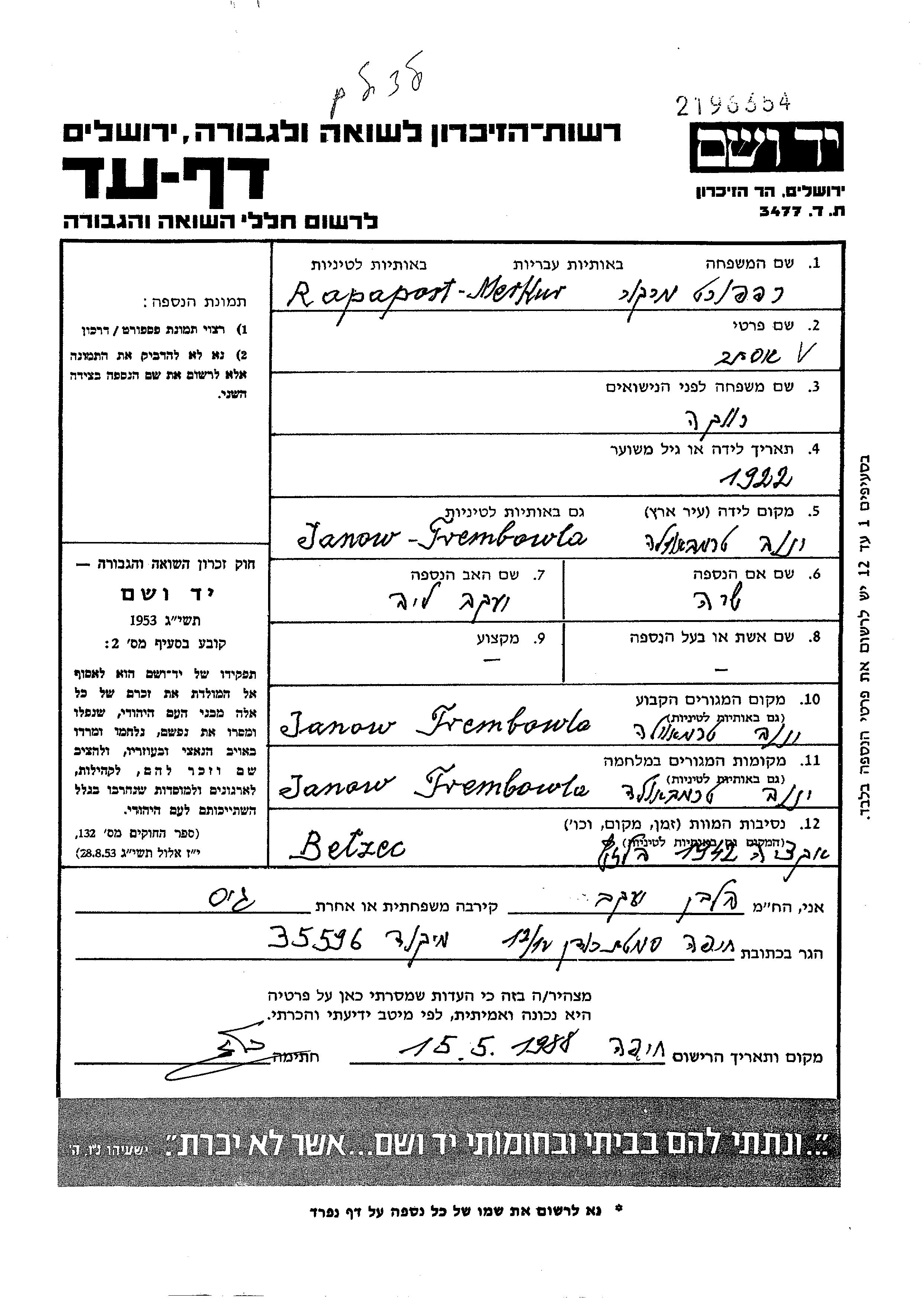 Rapaport Ester 1922 Janow, Pologne Feuille de témoignage