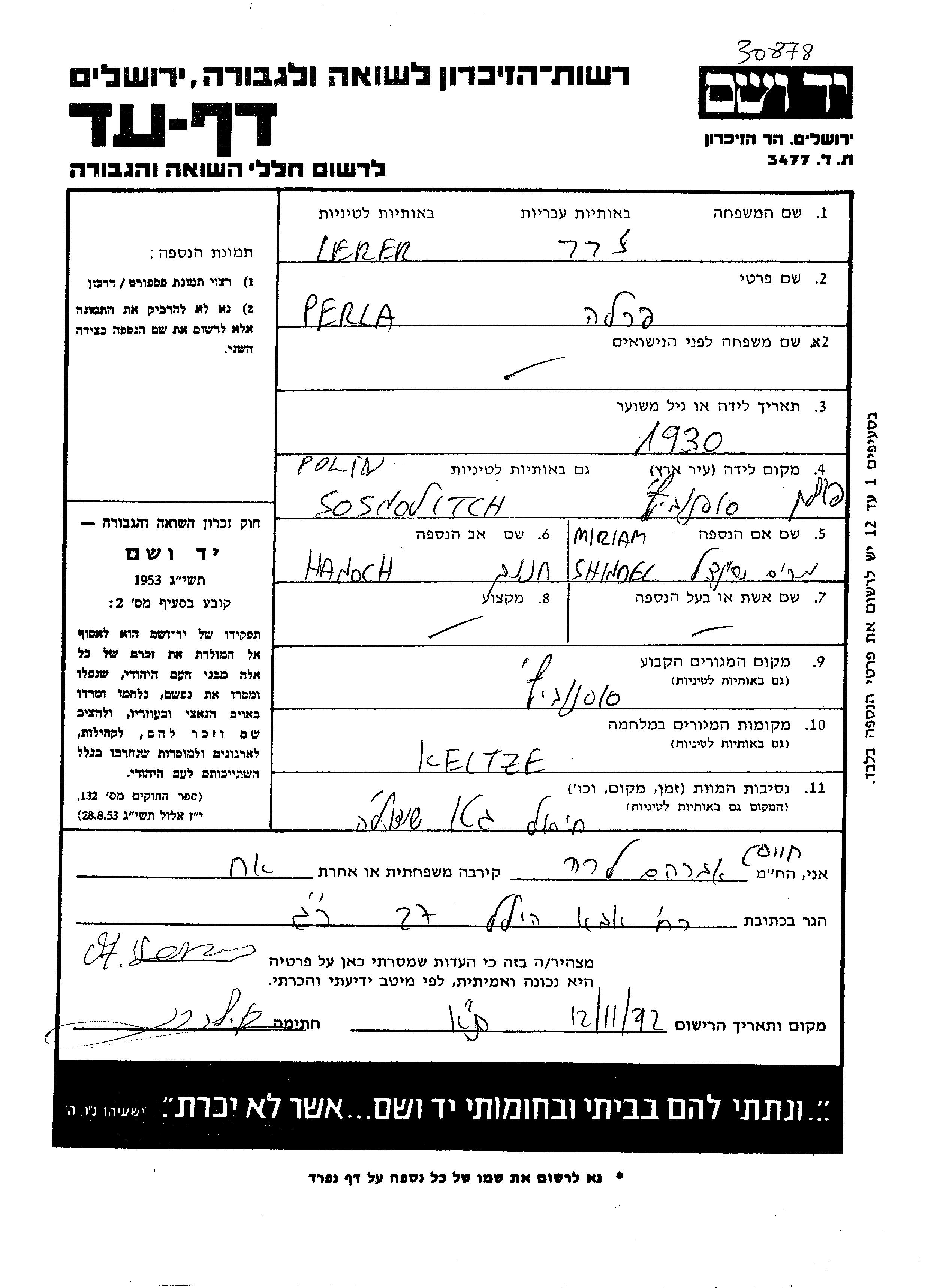 Lerer Perla 1930 Sosnowiec, Pologne Feuille de témoignage