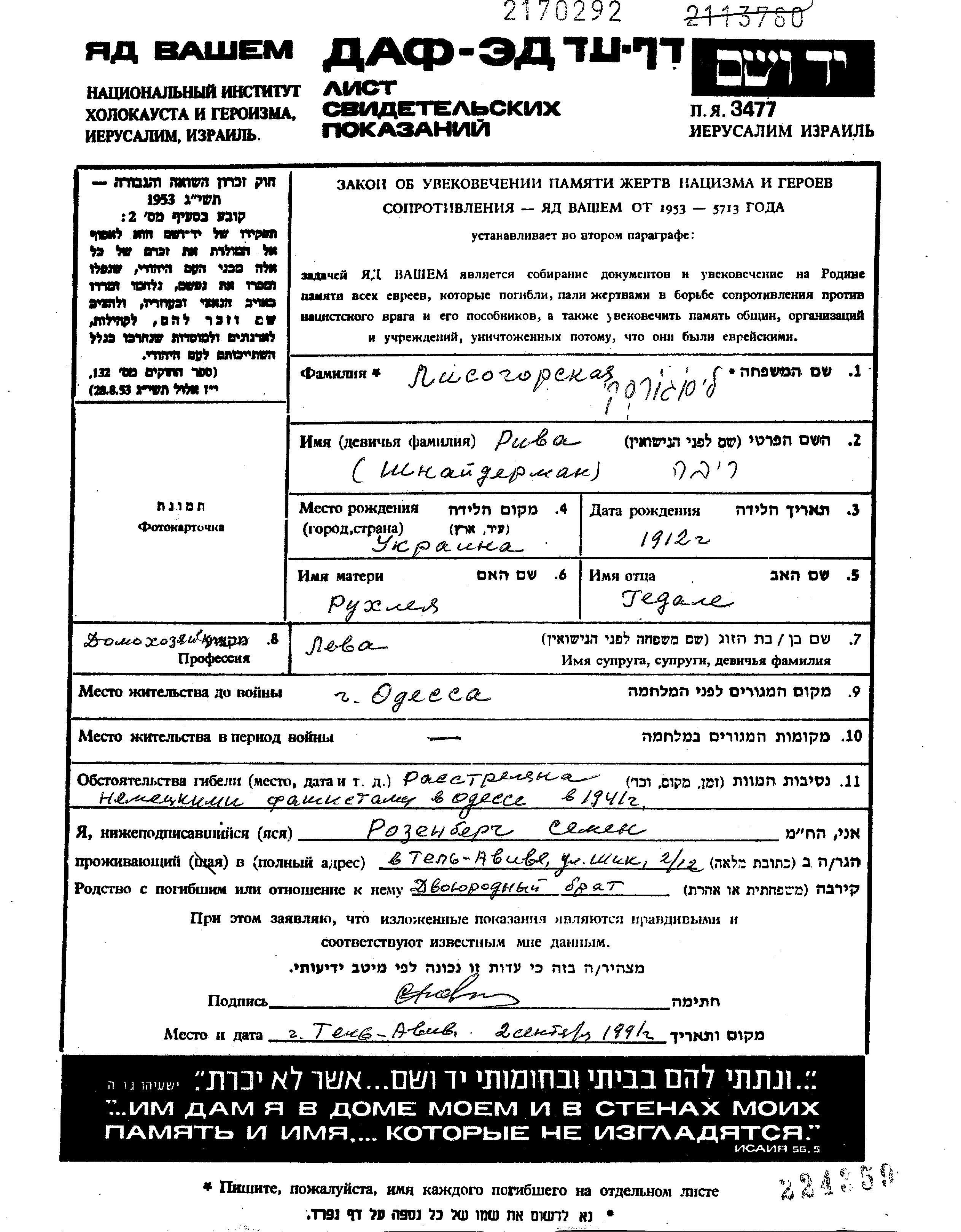 Riva Lisogorski née Shnaiderman est née à Ukraine (URSS) en 1912, fille de Gedale et de Rukhlea Lea. Elle était Femme au foyer et Mariée à Lyova Liuba. Avant la seconde guerre mondiale elle vivait à Odessa, Ukraine (URSS). Pendant la guerre, elle était à Odessa, Ukraine (URSS).