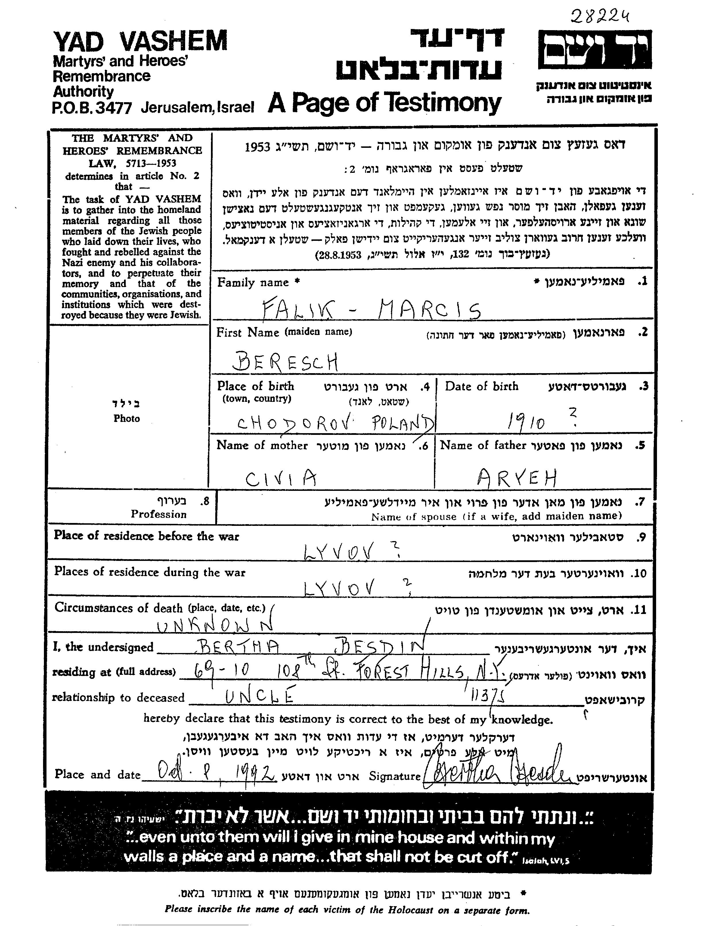 Marcis Falik Beresch 1910 Lwow, Pologne Feuille de témoignage