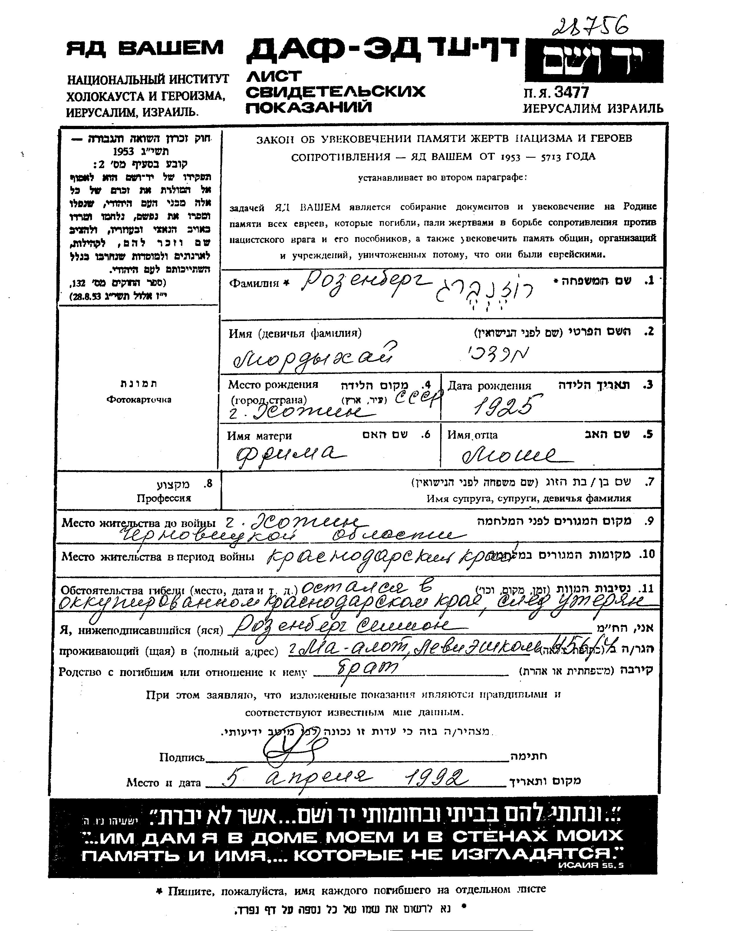 Rozenberg Mordykhai 1925 Hotin, Roumanie Feuille de témoignage