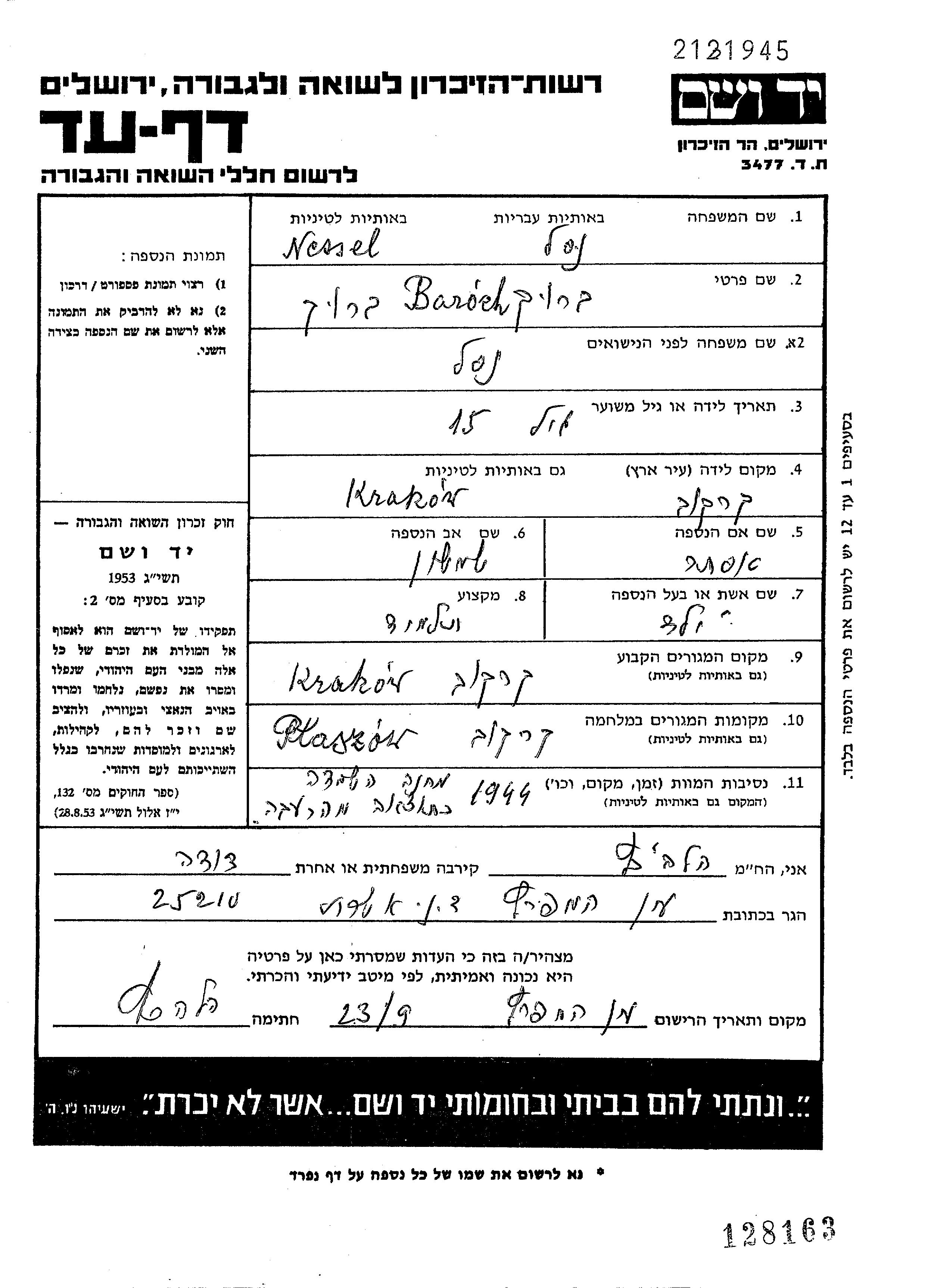 Baroch Nessel est né à Krakow, Pologne en 1929, fils de Shimshon et de Ester née Friedner. Il était Élève et Enfant. Avant la seconde guerre mondiale il vivait à Krakow, Pologne. Au cours de la guerre, il était à Krakow, Pologne.