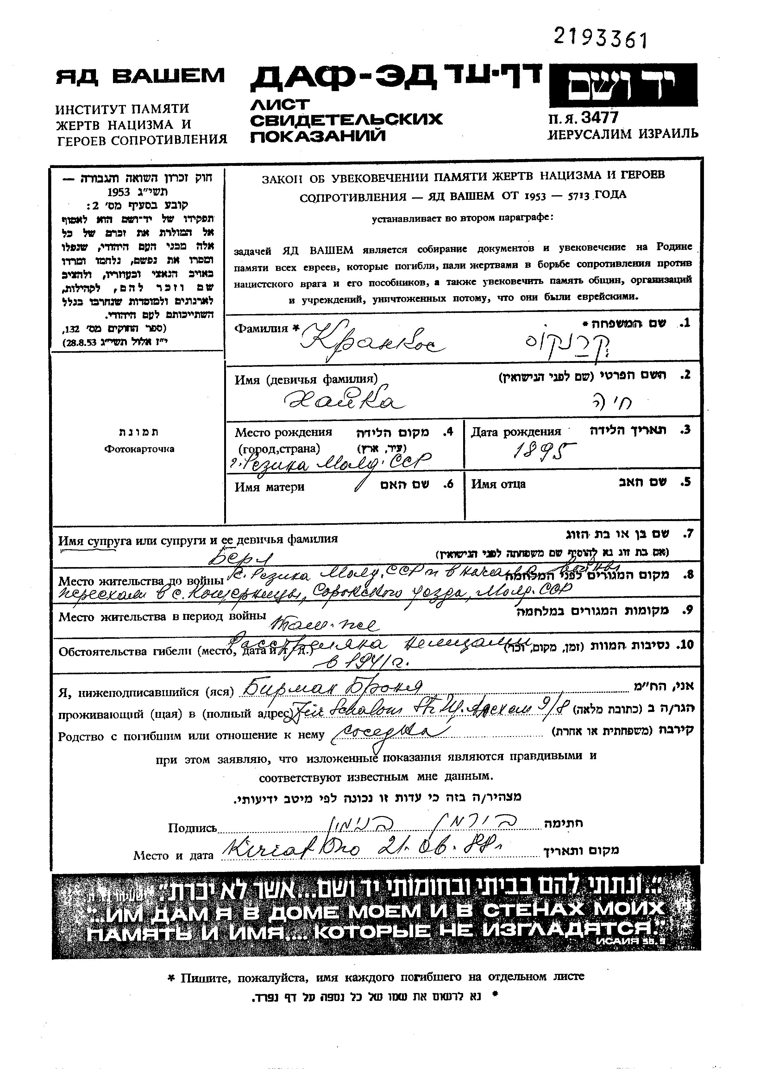 Khaika Krankos est née à Rezina, Roumanie en 1895. Elle était Mariée à Berl. Avant la seconde guerre mondiale elle vivait à Rezina, Roumanie. Pendant la guerre, elle était à Cosarnita, Roumanie.