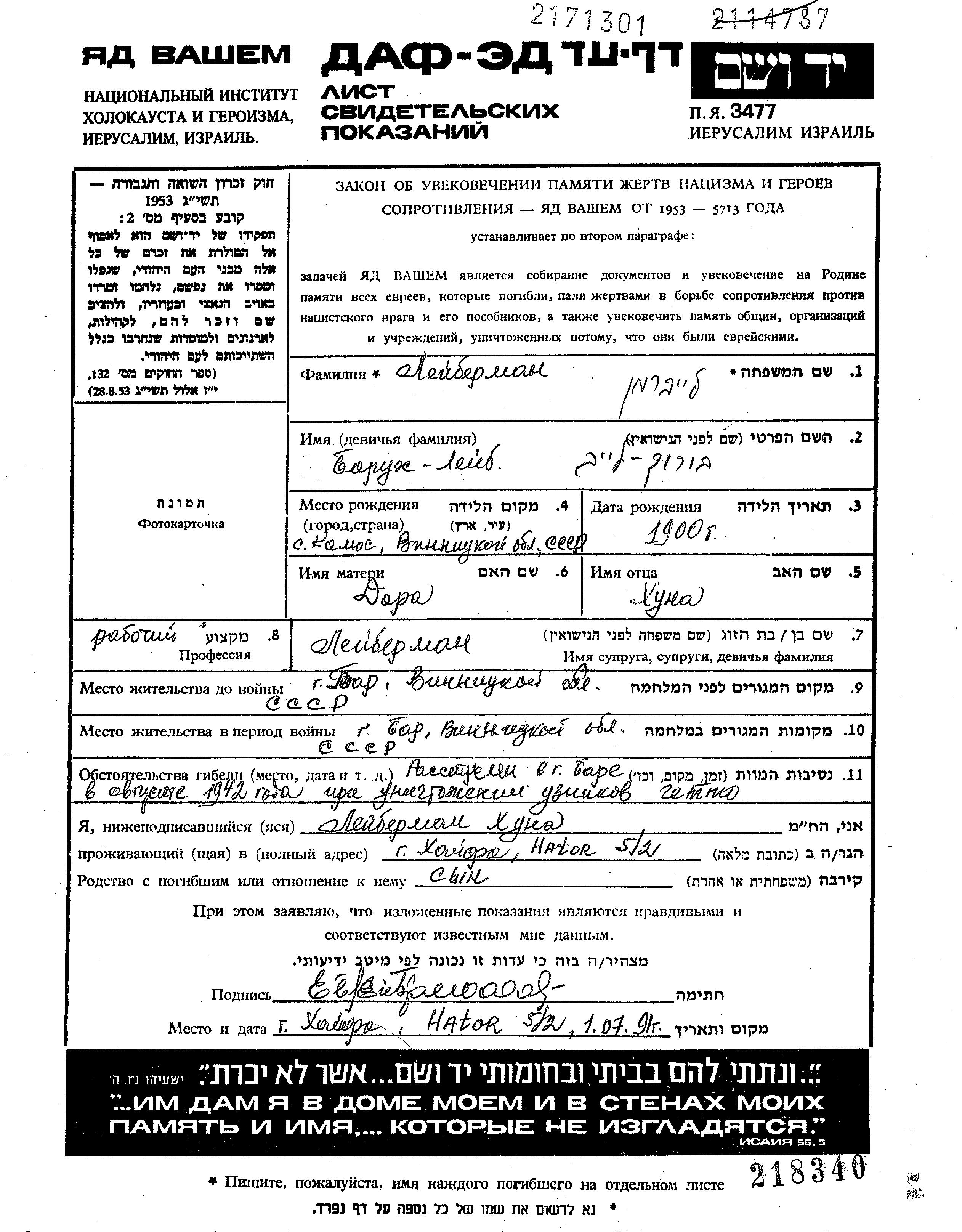 Leiberman Barukh Leib 1900 Bar, Ukraine (URSS) Feuille de témoignage
