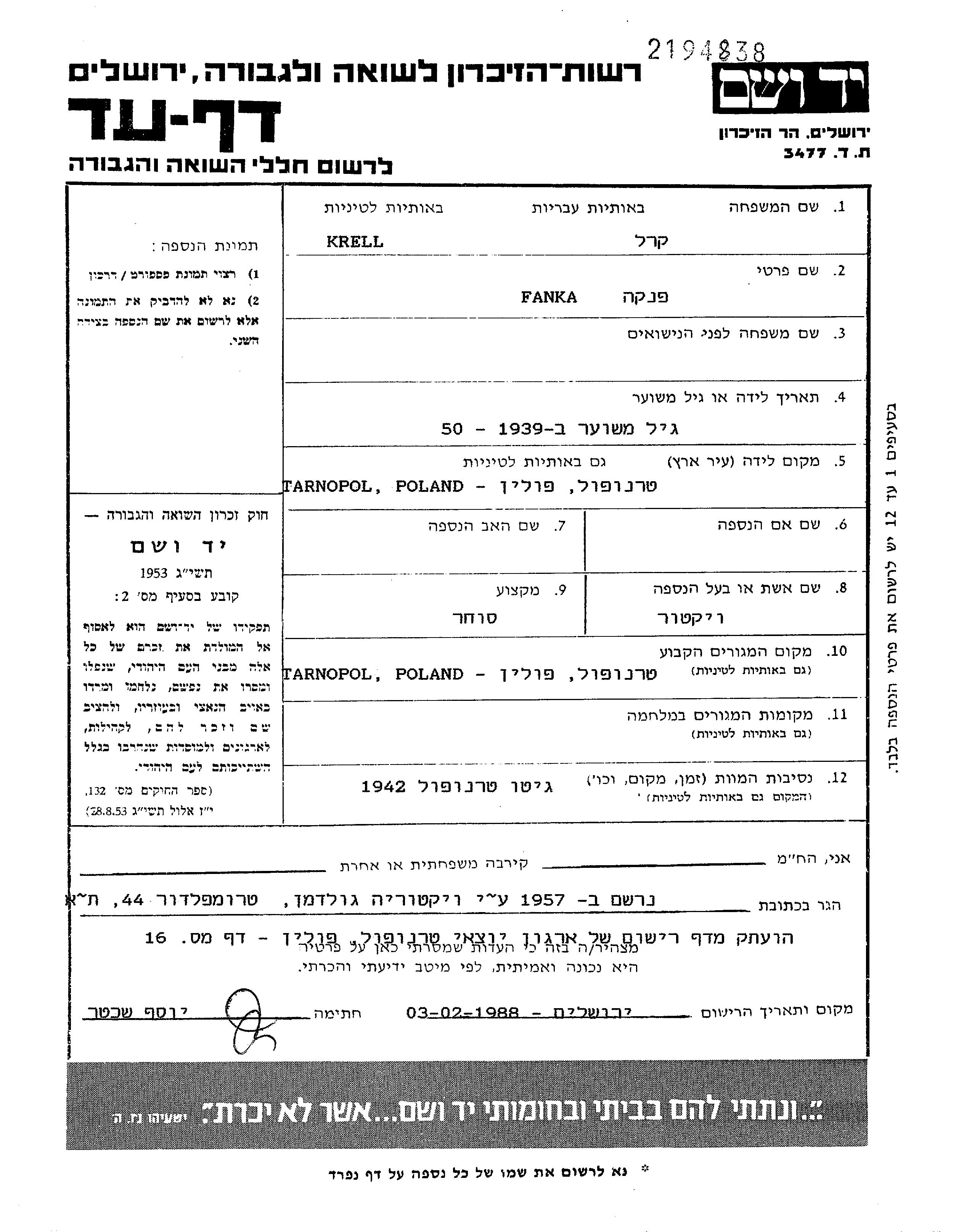 Krell Kral Fanka Tarnopol, Pologne Feuille de témoignage